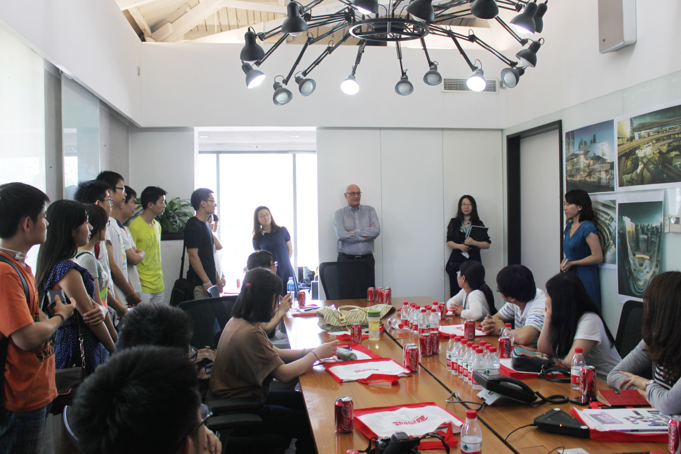 本次参观活动主要分为三个部分。首先,伍兹贝格的总裁作了简短的欢迎辞,并由事务所的人事处负责人带领大家参观其工作环境、公共交流空间和模型图书室,参观同时,其负责人还为同学们介绍伍兹贝格的企业文化、工作流程和日常活动等。第二部分是由项目主管介绍伍兹贝格的发展历程、设计理念和主要作品等。最后是互动环节,同学们主要从方案设计、团队合作、个人发展、工作待遇等多个方面提出问题,与伍兹贝格的几位主管进行了深入交流。最后,同学们与事务所的总裁和各位负责人合影留念,并领取了事务所分发的企业杂志和书刊,圆满结束了本次活动。
