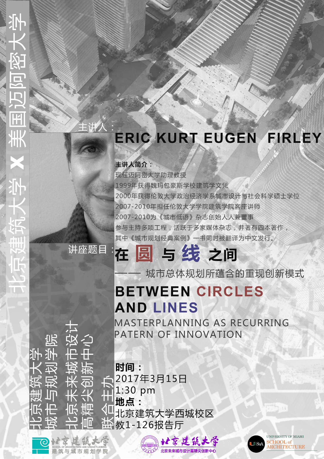 Eric Kurt Eugen Firley,现任美国迈阿密大学助理教授,于德国魏玛包豪斯大学(Bauhaus-Universit?t Weimar)获得建筑学学位,于伦敦政治经济公司(London School of Economics and Political Science)获得城市设计与社会科学理学硕士。2007 -2010期间,Eric在伦敦大学公司巴特莱特建筑公司(The Bartlett School of Planning, University College London)担任访问讲师,期间也曾在美国加利福尼亚大学伯克利分校(University of California, Berkeley)、新加坡国立大学(National University of Singapore)以及加拿大麦吉尔大学(McGill University, Montreal)等知名学府担任访问讲师。此前,Eric曾在巴黎和伦敦两座城市拥有多年设计和房地产工作经历。
