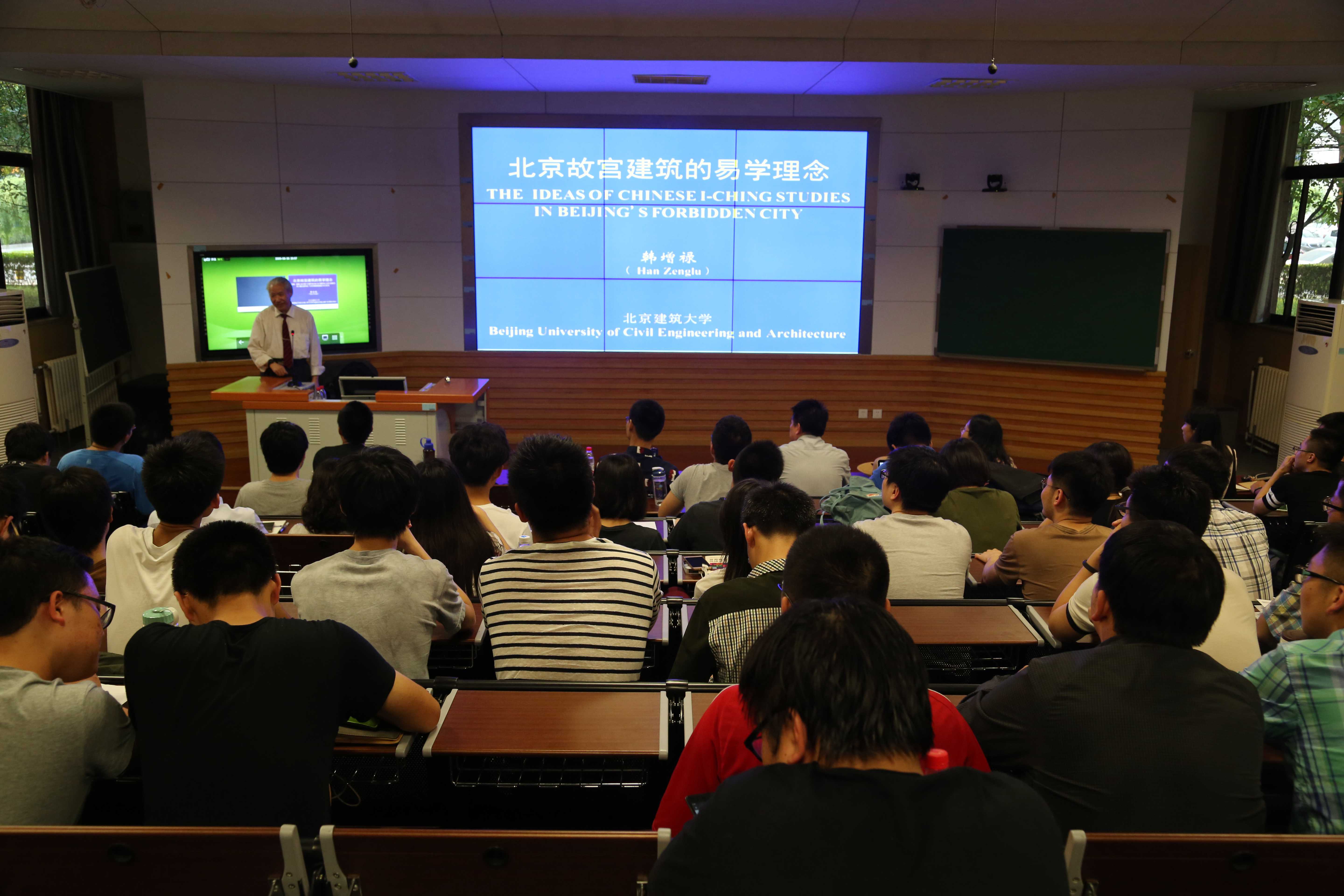 5月30日晚,建苑雅集第四期在西城校区第三阶梯教室开讲。本次活动请到了公司退休老教授韩增禄老师,为同学们带来“北京故宫建筑的易学理念”的学术报告。韩老先生是中国自然辩证法研究会理事、全国易学与科学专业委员会副理事长,曾编著《建筑·文化·人生》、《易学与建筑》等专业书籍。本次活动由建筑公司员工会副主席常远主持,一百四十余名师生参加了本次活动。