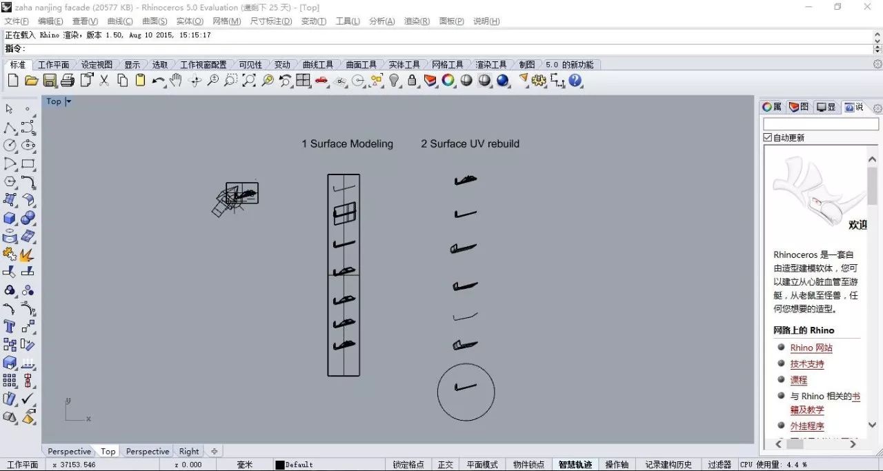 首先,宾大大牛给我们进行了自我介绍。大牛毕业于宾夕法尼亚建筑系,对软件有着浓厚的兴趣,并在大三自学软件。大牛强调了软件对于建筑的重要性,向我们说明现代建筑的状况,并提到了建筑造型地位的日渐提高。在介绍了公司的几个作品之后,大牛充分肯定了著名建筑师扎哈开创不规则建筑造型先河的精神。随后,大牛向我们展示了如何用rhino快速建模,以及快捷键的使用。