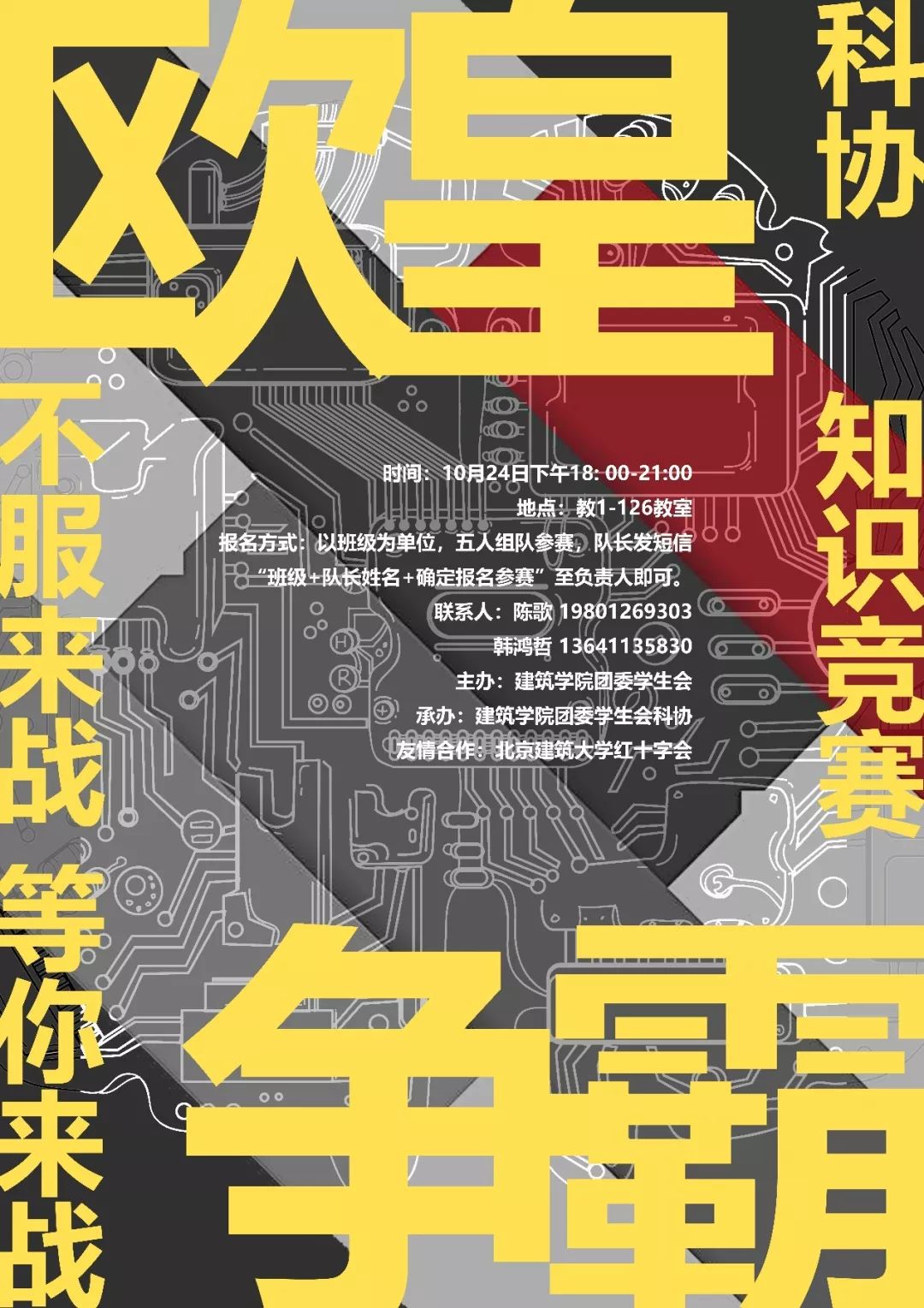 为以趣味形式丰富建筑公司员工的文娱生活,激发员工对身边知识的探索,展现建筑公司员工的风采。10月24日晚上六点,第四届“欧皇争霸”不服来战百科知识竞赛在教一126准时开赛。本次竞赛由建筑公司团委员工会主办,建筑公司团委员工会科协承办,以班级为单位,五人组队参赛。2018级五个专业在内的9个班级积极参与。在科协部员的主持下,竞赛正式拉开帷幕。