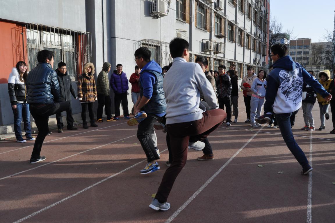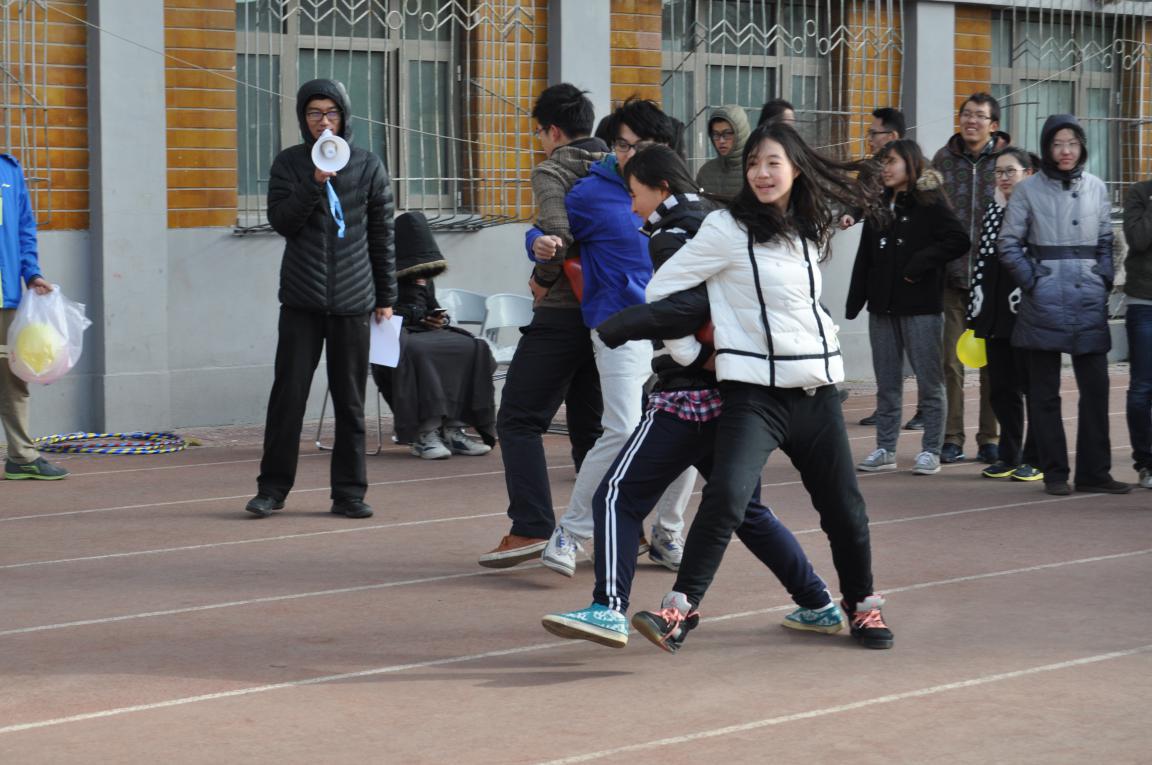 第一个进行的是螃蟹背西瓜,2 名队员背对背手挽手站于起跑线后,共同用背部夹住气球前行,保证气球不掉不爆。在考验大家协作与速度的同时,略显滑稽的动作也趣味性十足,大家笑声连连。随后是需要全体部员参加的跳长绳比赛。大家的技术参差不齐,但仍互相包容,甚至各部之间互相帮助,让这次的趣味运动会更具温情。第三个进行的是抢椅子,主要考验的是各部部长的观察能力、灵活反应与坚决果断。大家包围成圈观战,为部长们加油,一片笑语欢声。踢毽子与套呼啦圈接力都主要体现团队配合能力,但一个更强调耐心,一个则需要速度。最后一项比赛,也是最激情的斗鸡比赛,负责组织比赛的体育部的部员也参加了这个比赛。大家需要在保护自己“鸡王”的同时将别队的“鸡王”挤出边界。靠的是团队的计谋、技巧、力量。大部分队伍都是清一色的男生,让比赛更加激烈有趣,乐翻全场。运动会最后,外联部夺得第一名,办公室第二、生活部第三。排名前三的队伍纷纷领到了自己的奖品。
