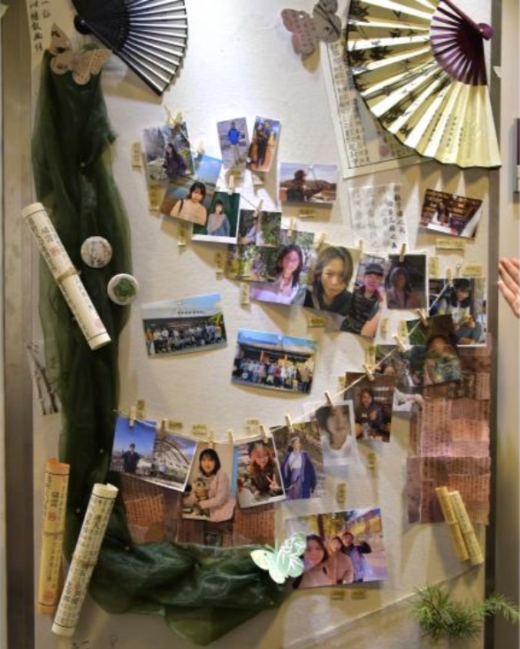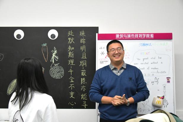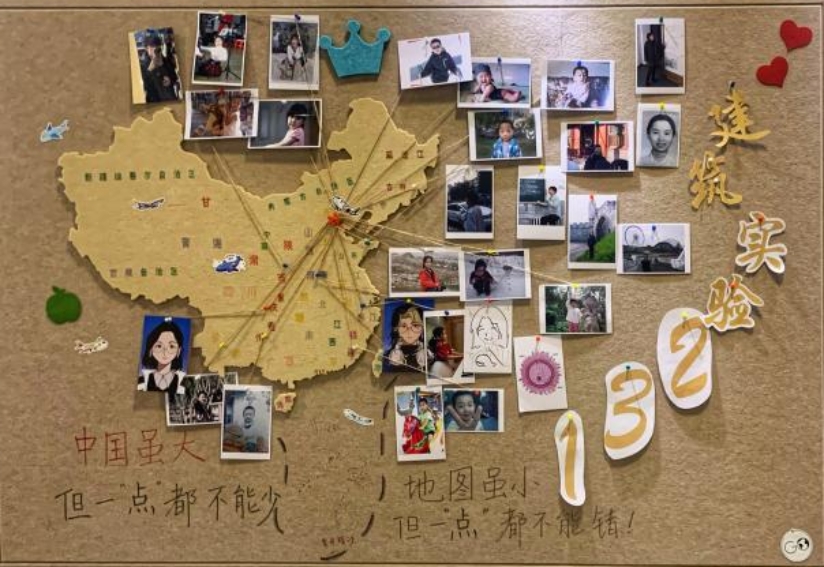 班级展示墙上挂著名建筑师图片及他们的名言,还挂我们班级合照。既介绍成员,同时寓意我们可以像他们一样创造出成绩。本班黑板是大家互动的地方,大家在此交流产生灵感。黑板上双睛寓代表我们要时刻严于律己。