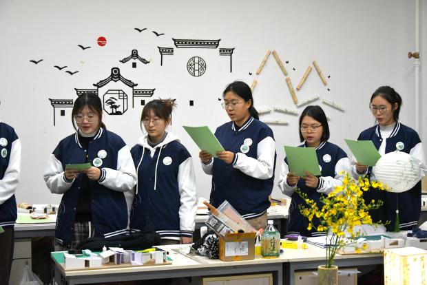 班级整体围绕“竹”这一元素进行班级的建设。“竹”代表着坚韧的人格、节节向上不屈的意志以及谦虚的美好品质,它亦是园林里不可或缺的景观之一,所以专教均围绕“竹”以及自然做装饰。男生以高亢的朗诵展现坚韧气概,女生以轻柔的朗诵展现青春之自我,而后全班进行《竹林间》一曲演唱,伴随着同学的古琴演奏,体现本班独特的风采。