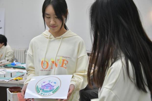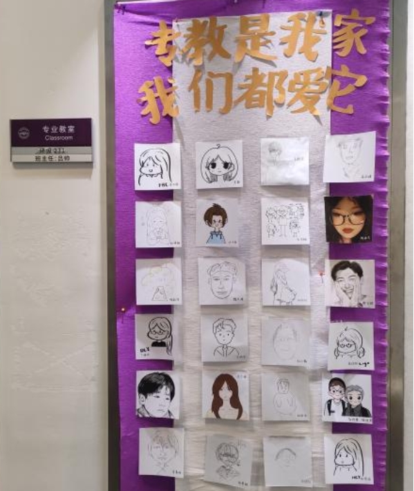 环设231班徽图标中央的一座房屋和围着房屋的树叶代表环境设计所涉及的建筑和绿化。文化衫主体为白色,正面胸前印有我们的班徽,背后是一个紫色印花我,代表了建筑大学。班级文化墙上挂满了班里每位同学的自画像,在体现班级同学手绘能力的同时更展现出班级温馨的氛围,班级专门设置了放做模型时废弃的刀片集中收集起来,避免了打扫教室时同学们被划伤的风险,同时也更方便集中处理。