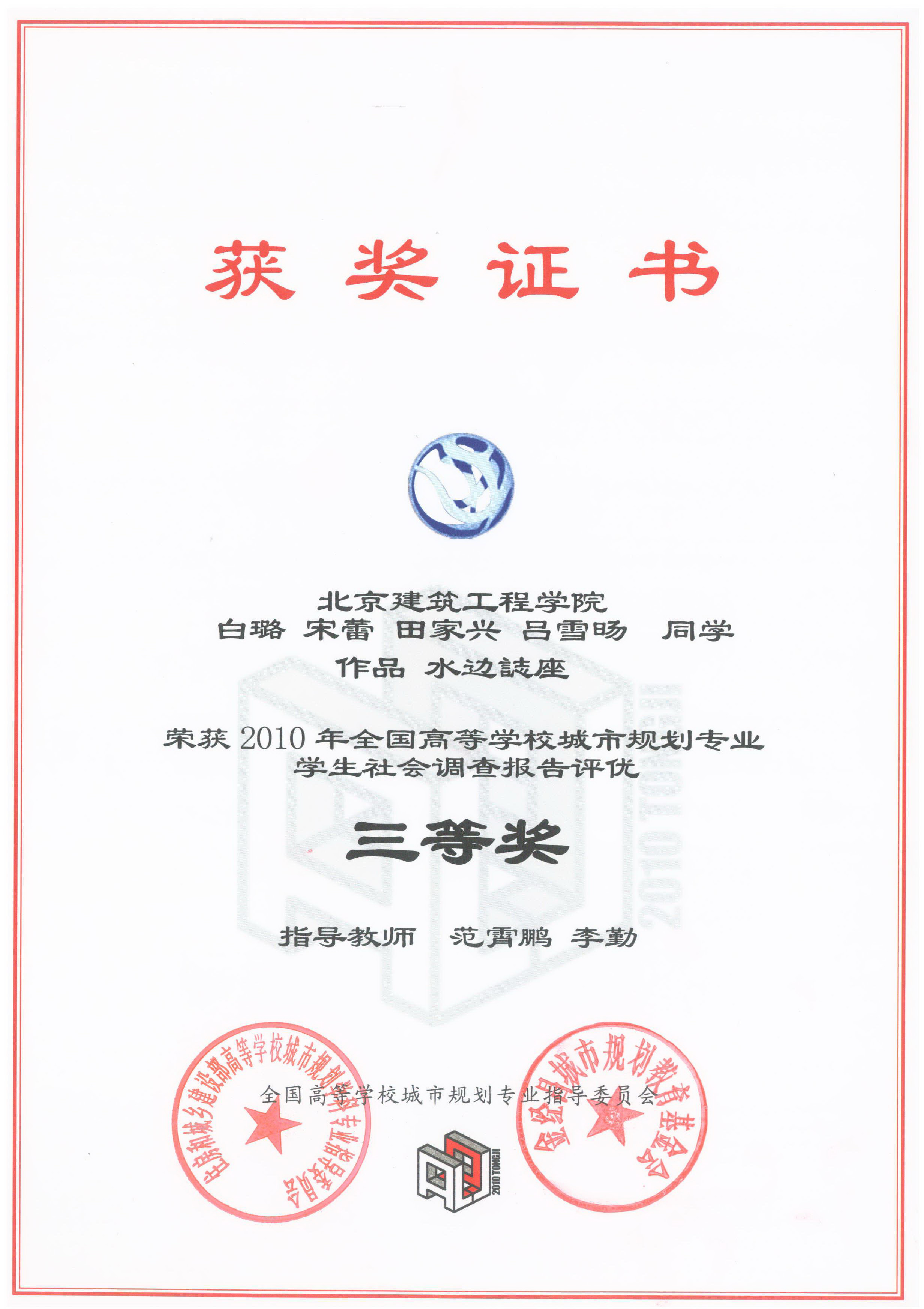 bevictor1946韦德官网员工喜获2010年全国高等公司城市规划专业员工社会调查报告评优三等奖