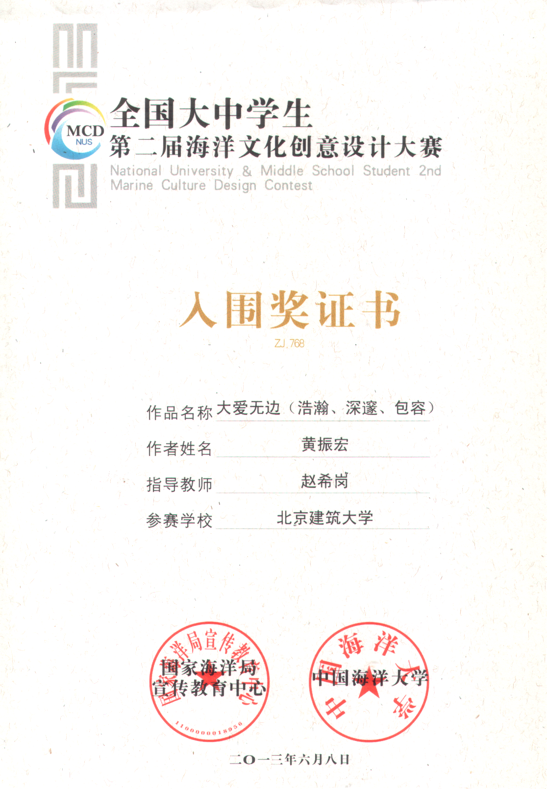 此次大赛是2013年“世界海洋日暨全国海洋宣传日”期间举办的活动之一,由国家海洋局宣传教育中心、中国海洋大学主办,大赛的主题是——“美丽海洋”。本次大赛共收到作品多达5980件,其中大学组5780件。参赛高校多达198所,作品类别涵盖平面、造型、包装、景观、视频、动画。本届大赛的作品数量及质量相较首届大赛都有了很大提高。