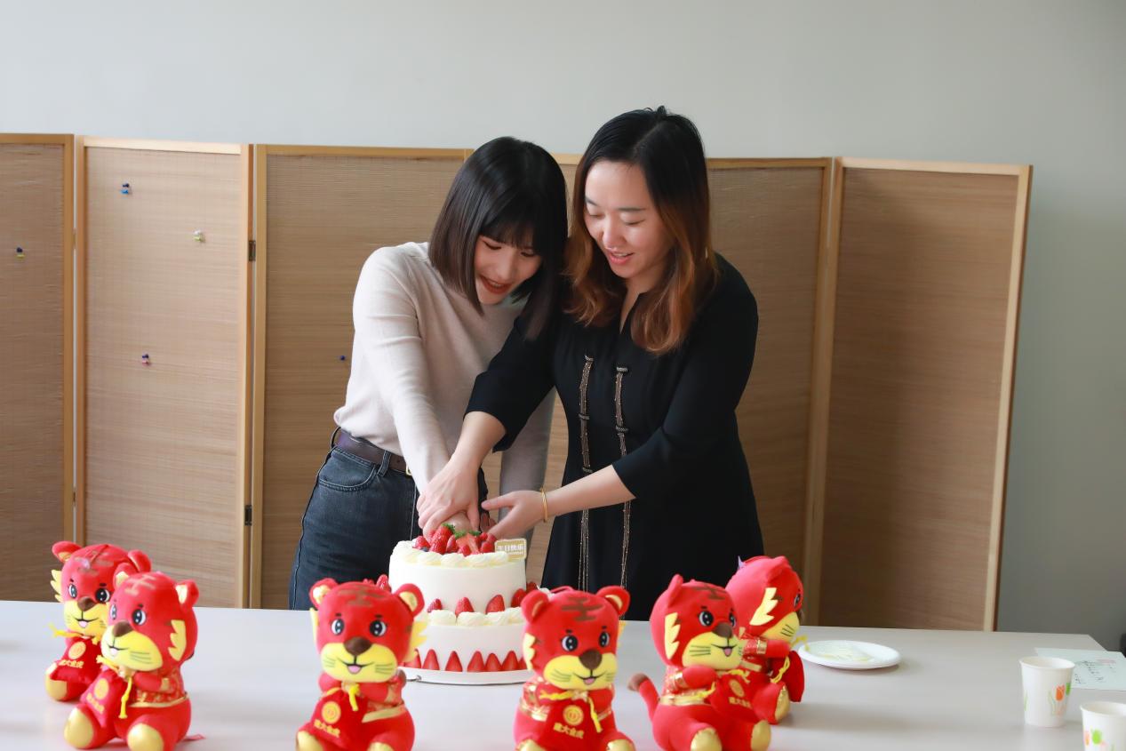 切蛋糕的环节中,生日正日子在1月5日的福星张曼老师和在场年龄最小、刚刚入职的福星王瑞琦老师共同切下生日蛋糕第一刀,伴随着悠扬的《生日快乐》背景音乐,福星们纷纷许下美好心愿,大家一起品尝美味蛋糕、分享此时此刻的温馨与甜蜜。