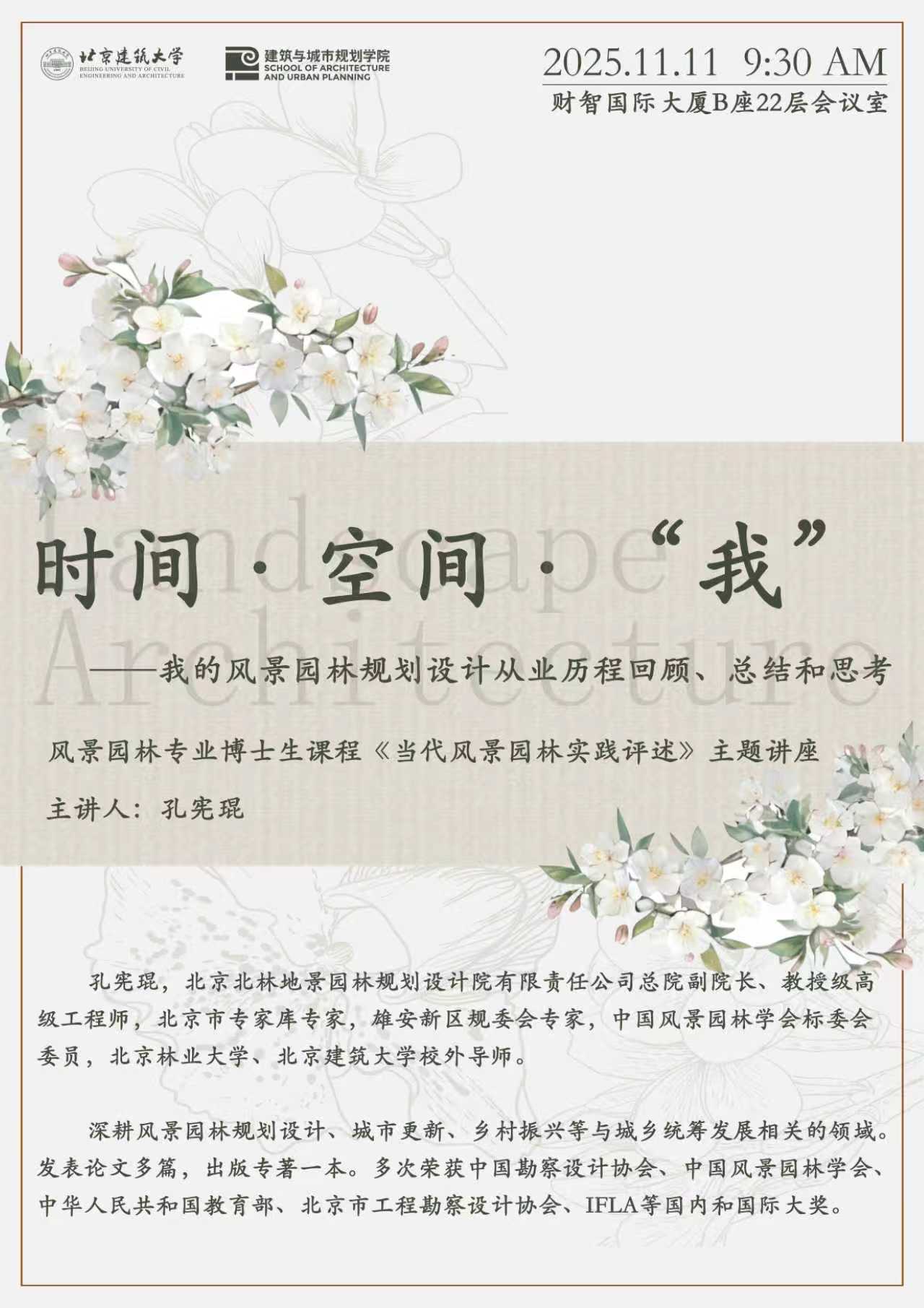讲座以“时间”“空间”与“我”三个关键词为主线,梳理了自1996年以来中国快速城镇化背景下风景园林行业的演变,并结合北林地景的发展历程展现了行业机构如何在时代浪潮中不断调适、创新与坚守,探讨了设计师在自然与人居、传统与现代、艺术与工程之间的角色定位和价值追求。
