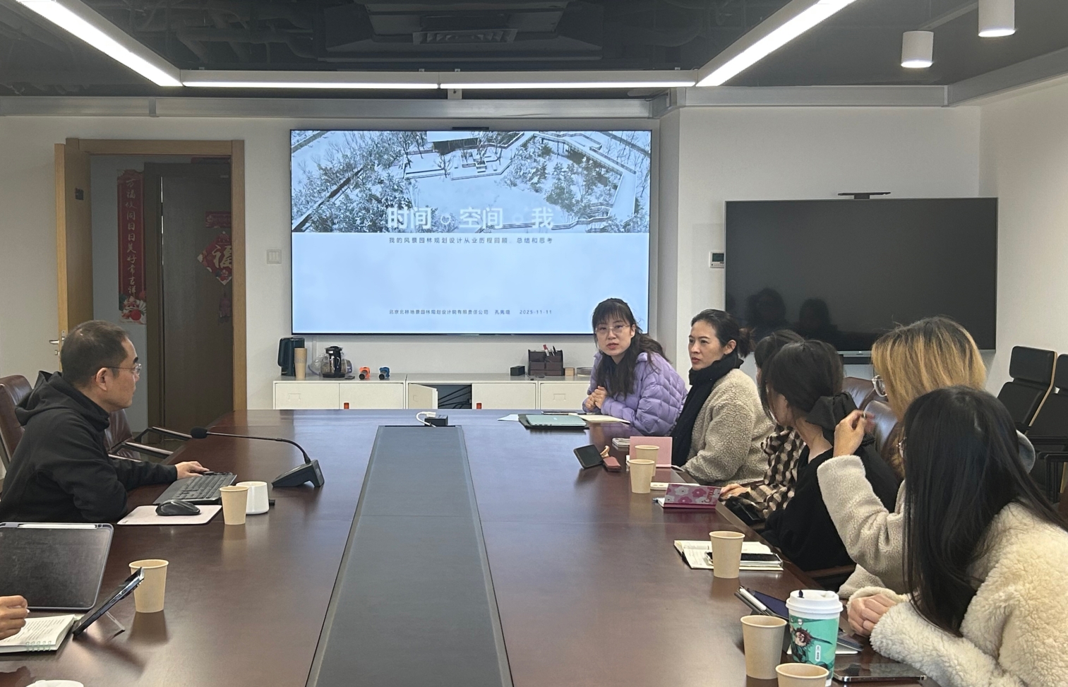 中场休息期间,在座师生在孔老师的引导下参观了北林地景设计院的办公环境、项目成果展与企业荣誉墙。走廊中陈列的从概念草图到建成照片的完整项目介绍,具象地揭示了设计从构思到落地的全过程,为讲座中的理论阐述提供了现实注脚,也让同学们得以近距离感受一线设计院的日常工作状态。