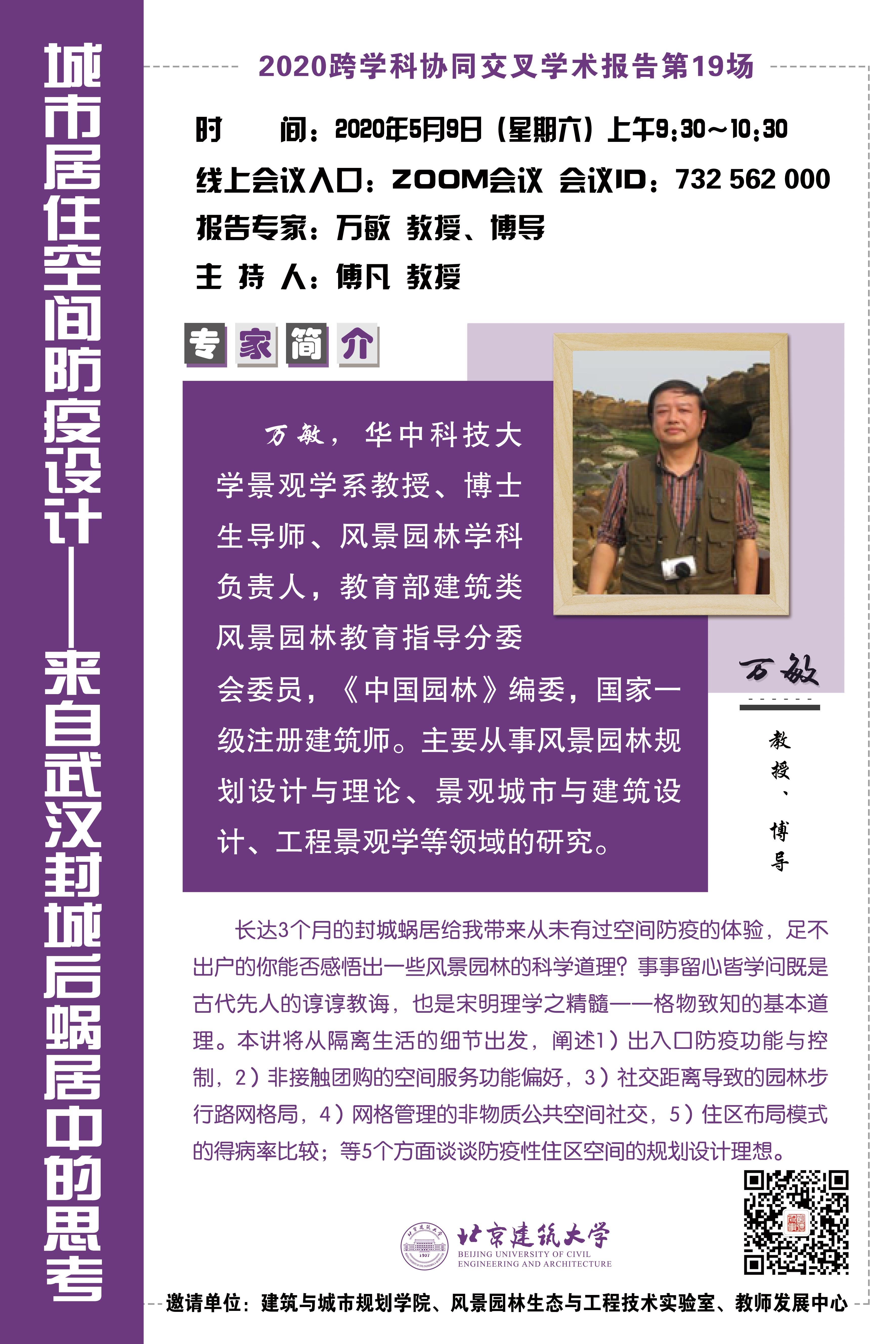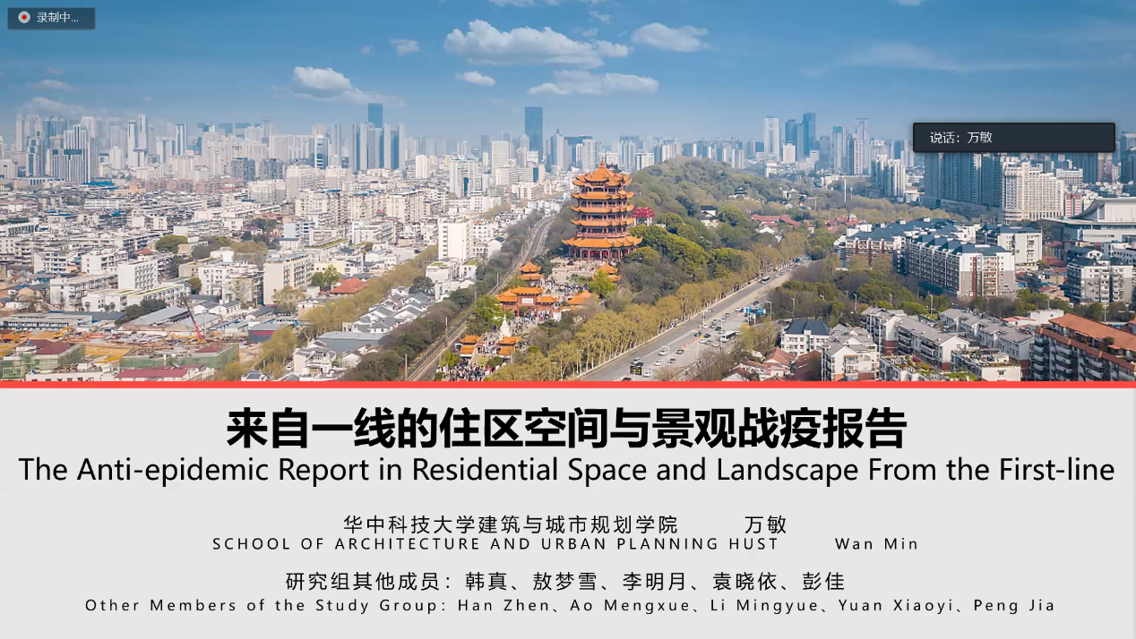 5月9日上午,华中科技大学景观系博士生导师、风景园林学科负责人、《中国园林》编委万敏教授应公司邀请,在ZOOM平台上以“城市居住空间防疫设计——来自武汉封城后蜗居中的思考”为主题展开分享,公司建筑公司傅凡教授主持本次讲座。来自公司师生和校外学者共100余人参与本次线上学术交流活动。