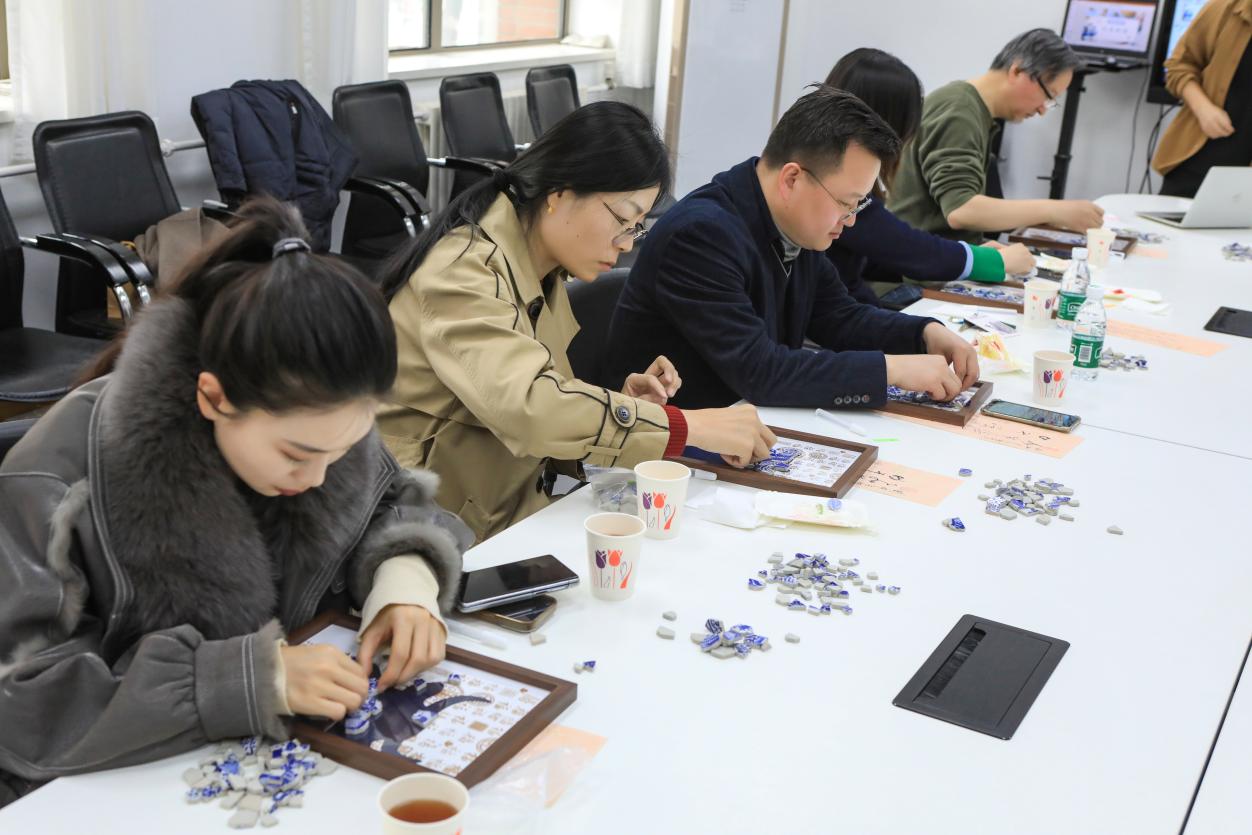 活动尾声的“巧手时光”环节中,寿星老师们在轻松愉悦的氛围中动手体验瓷片拼贴创作,将一片片青花瓷片细致拼接成自己生肖的艺术作品。制作过程中,大家专注投入、相互交流,在亲手创作中感受手作艺术的乐趣,也在点滴协作中体会到公司大家庭的温情与默契。小小瓷片承载着巧思与祝福,不仅为这场春日庆生会画上了温馨而雅致的句点,也让美好记忆在指尖流转中悄然珍藏。