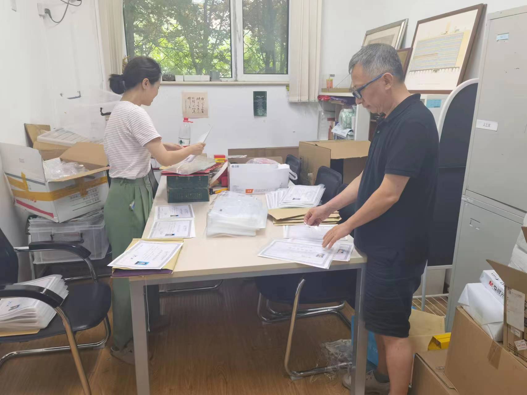 建筑公司教学管理办公室王宇石老师连续多日投入相关工作,核对毕业生信息、打印成绩单、张贴毕业证、学位证照片。6月21日中午,教学管理办公室刘志刚、王宇石、黄庭晚三位老师赴大兴校区教务处完成毕业证、学位证盖章工作,之后赶回西城校区分装材料。当晚所有毕业生的证书等相关材料由公司采用快递寄出。