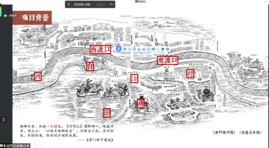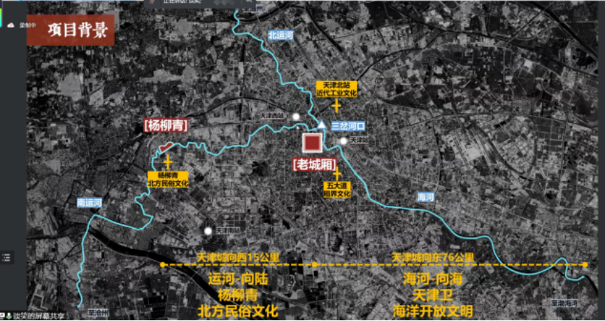 开题研讨会由开题介绍、开题交流、开题研讨三部分组成。首先,由出题方天津大学建筑设计规划研究总院谭啸所长对杨柳青大运河国家文化公园的项目背景进行了详尽介绍。2014年京杭大运河入选《世界遗产名录》,杨柳青作为沿运河两岸的“巨村“,承载了关于大运河南运河段的丰厚文化遗产与历史积淀。如今,大运河将作为国家文化公园重点建设项目之一,为运河文化的发展、运河两岸的活化利用提供了新的机遇。谭所长从杨柳青的历史脉络到民俗文化内涵,从非物质文化遗产、城乡建设、运河工程与自然环境等角度对运河进行多层次的文化解读,展现了运河文化“美的历程”。谭所长随后也对该地块已有的多轮设计进行简单介绍,如“以地文传承实现空间创作”、“文化学镇”等相关设计,为同学们对地块了解提供了更加开阔的视野。最后,谭经理结合已有工作提出了地块现状条件的详细信息与城市设计的刚性管控要求,如文物保护要求、核心保护区范围、建设地带的高度控制等等,并对本次联合毕设的成果表达期待与支持。