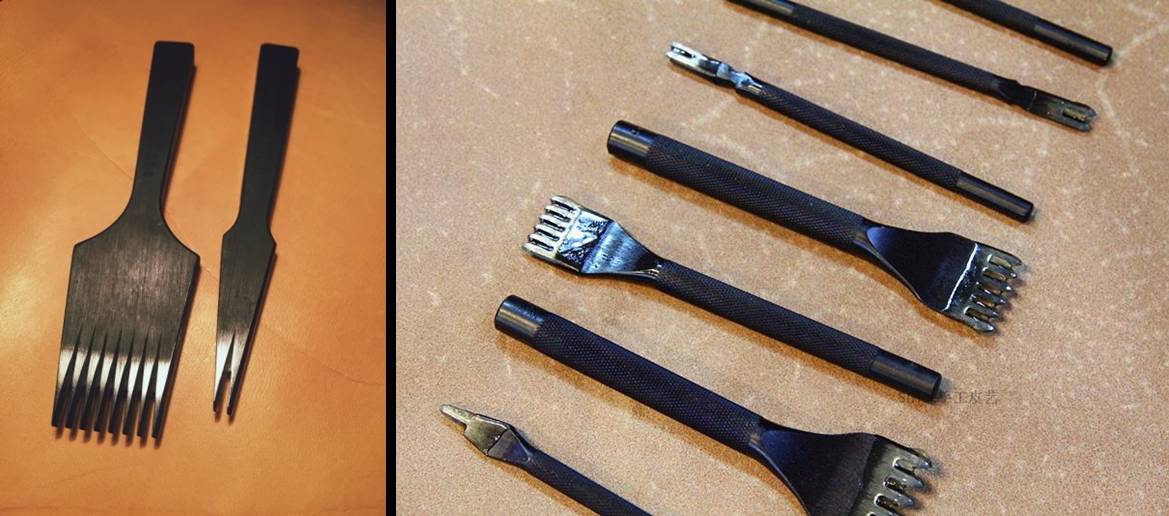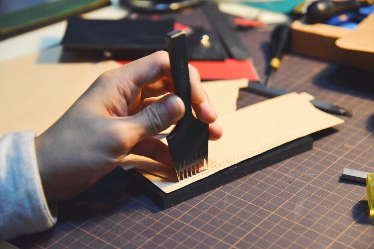 用菱斩顺着开好的槽打。如果皮革较薄,或者有一面在里,可以两层三层叠在一起用斩。如果是缝两面都露在外面的,比如钱包,建议分开两次打斩。