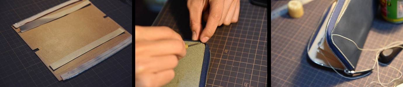 手工皮具是用双针对缝的方式,一根线两头穿针,然后在皮革正反两面相对缝。缝合的步骤是首先缝合一张皮上的拉链等辅料,然后再次进行组装。