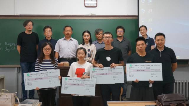 接下来,由建筑学九零级员工代表窦志、赵敏代表九零级建筑学专业全体员工为公司捐赠奖学金,并与经理张大玉、课程教师为获奖员工,来组建131王晴、建131刘久源、建132穆帅文与建132李啟潍的四位同学颁奖,合影留恋。