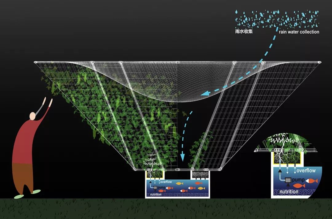 天空农场是非标准营造的“农构”装置,以平民的价格创造最有效的生产空间,达到尽可能大的推广效应:一万元在北京市中心可以买到一个立足之处,一万元在河北沧州可以买到一平米,一万元可以在深圳南头村搭建一个400平米的天空农场,同时实现场地最小干预+雨水收集+鱼菜共生。