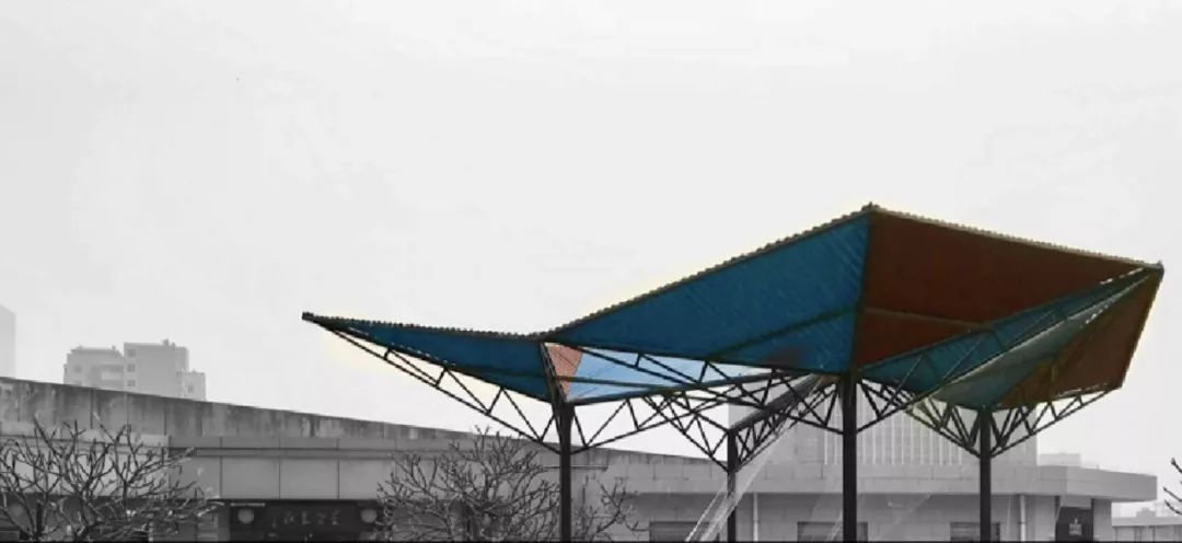 团队的另外一个作品,也在双年展期间受星空农庄的庄主何铮先生之邀在星空农庄的屋顶平台上实践出来。作品采用不同颜色的彩钢板和轻钢结构共同组建——红蓝彩钢板+爬藤网;遮阳休憩+雨水收集+屋顶绿化;农业+小工业。设计试图挖掘廉价材料潜在的美学意义和结构潜力,提供新的集会空间和复合型生态营造方式。