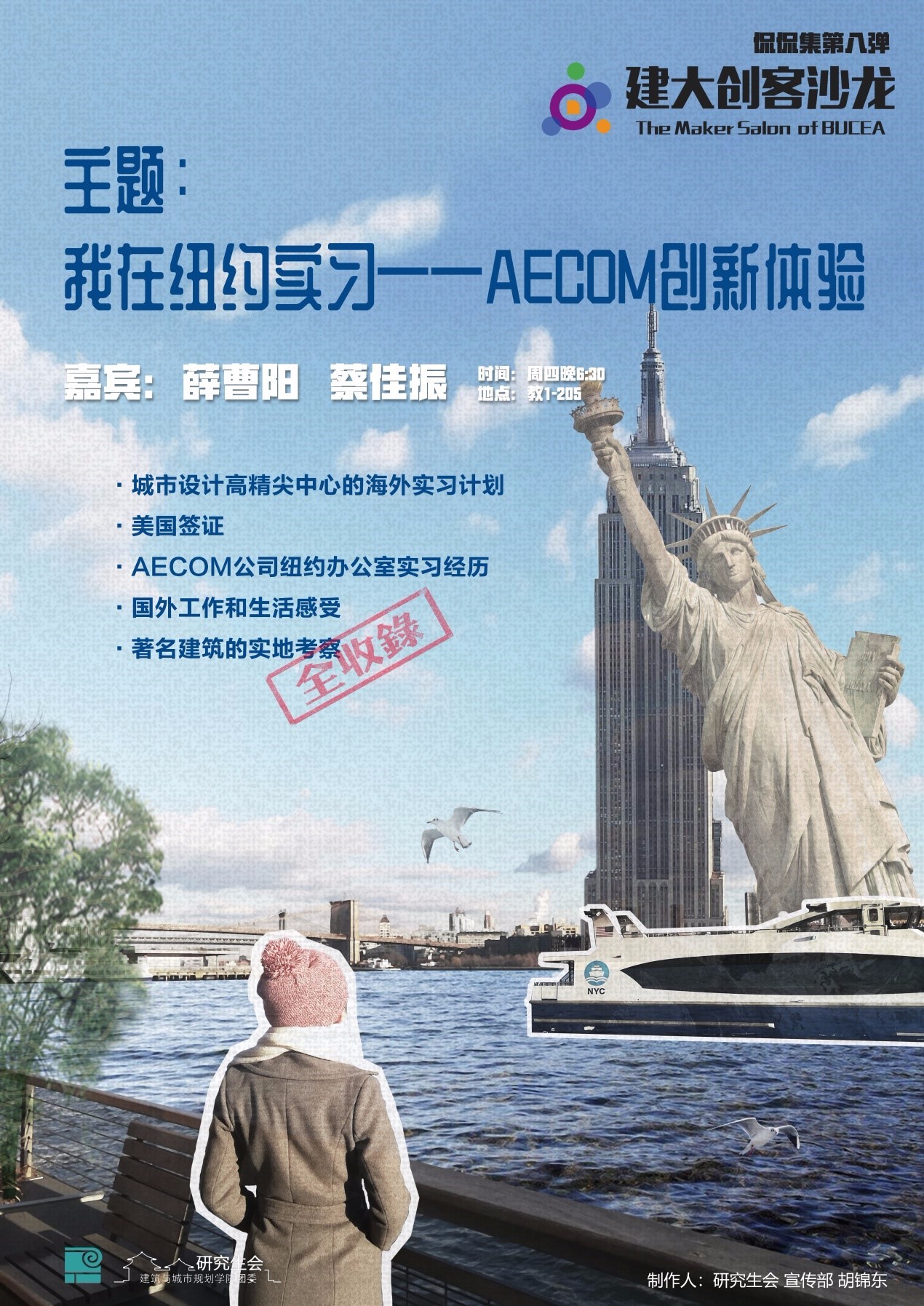 2018年3月,建大创客沙龙正式开讲,建筑公司侃侃集系列员工沙龙,作为创客沙龙活动的一部分,于3月15日晚6点30分,在公司西城校区教一205教室开展新学期的分享。侃侃集员工沙龙,是建筑公司研究生会主办,由员工作为主讲人的特色创新沙龙,本次沙龙是侃侃集系列活动的第八弹。寒假期间,北京未来城市设计高精尖创新中心选派公司2016级硕士研究生参与海外实习计划,前往美国纽约AECOM公司开展实习实践。本场沙龙邀请到参与该实习计划的薛曹阳、蔡佳振两位同学与大家分享他们的实习及创新体验。