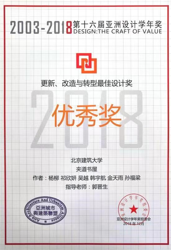 由公司建筑公司研究生杨柳、祁欣妍、韩宇航、吴越、建筑学本科生金天雨、孙福梁6名员工设计的“夹道书屋”建筑设计作品,荣获2018年第16届亚洲设计学年奖—更新、改造与转型最佳设计优秀奖,指导教师是郭晋生教授。