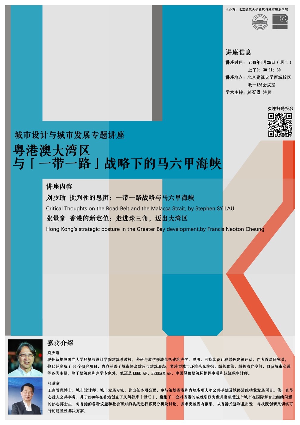 建设粤港澳大湾区、开展“一带一路”经济合作是新时代下推动形成全面开放格局的新发展战略,也是推动“一国两制”事业发展的新实践。为了让同学们增进对这两项国家发展战略的了解,6月25上午郝石盟老师特别邀请到新加坡国立大学设计与环境公司的刘少瑜教授和香港著名城市设计师、城市发展专家张量童先生从“大湾区”与“一带一路”建设角度,围绕马六甲海峡与香港等关键性发展因素做了精彩的讲座。