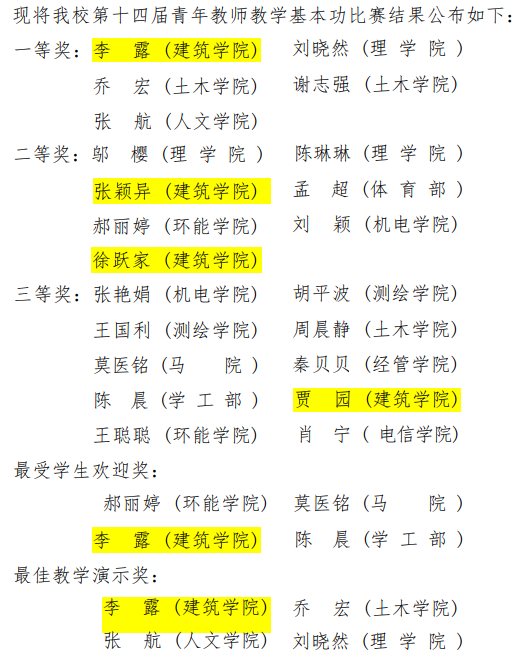 建筑与公司历来重视青年教师的教学基本功培养,重视青年教师的发展。为了准备本届比赛,公司党委书记何立新、教学副经理李春青、各专业负责人、院督导组、上届青教赛市级赛一等奖获得者孟璠磊组成了比赛评议组,在2022年春季学期进行4场院级选拔赛,推选出贾园、张颖异、李露、徐跃家四名教师参加校级赛。2022年秋季学期、2023年春季学期评议组又举行了3场培训试讲,为上述四位教师提供讲课演示、教案、PPT演示等系列辅导,精心打磨,全面提升,为本次竞赛获奖奠定了坚实的基础。