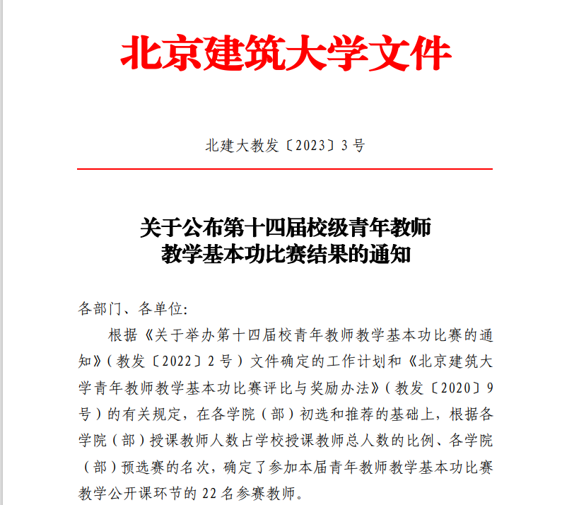 根据公司“关于公布第十四届校级青年教师教学基本功比赛结果的通知”(北建大教发〔2023〕3 号),建筑公司4名参赛教师分别获得比赛一、二、三等奖。其中,风景园林系李露老师获得一等奖、最受员工欢迎奖、最佳教学演示奖;城乡规划系张颖异老师、建筑技术部徐跃家老师获得二等奖、建筑系贾园老师获得三等奖。这次获奖再次展现了公司青年教师的教学风采和水平。