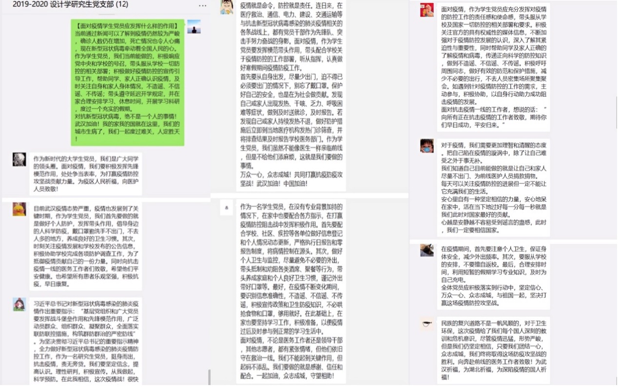 为深入学习贯彻习近平总书记对新型冠状病毒感染的肺炎疫情的重要指示精神,落实公司、公司党委相关工作部署,进一步加强党建引领,发挥员工党支部在防疫控疫工作中的战斗堡垒作用。2020年1月31日,设计学研究生党支部组织全体党员开展线上视频学习活动,学习文章《中国已是走向成熟的负责任大国》,谈“面对疫情员工党员应发挥的作用”。
