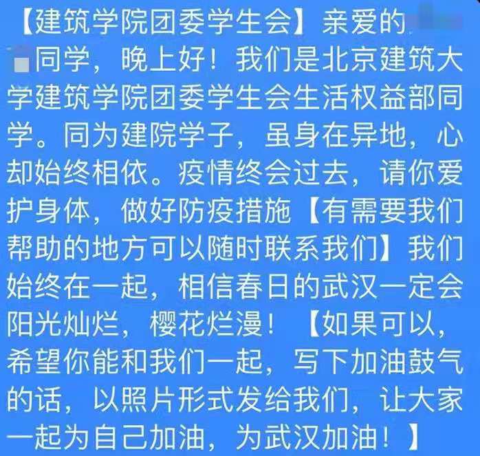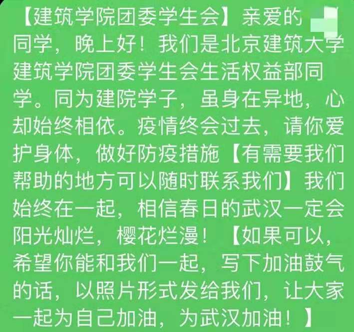 建筑公司团委员工会生活权益部在近期,陆续向身处湖北的同学以丰富的形式发出问候。我们虽身在异处,但心却始终相依。我们坚信疫情会过去,也希望通过我们的问候和微薄的努力,可以让身处湖北的同学们感到温暖,并对抗击疫情充满信心。