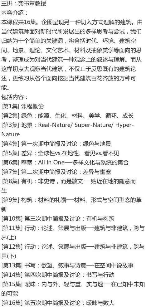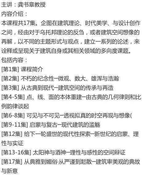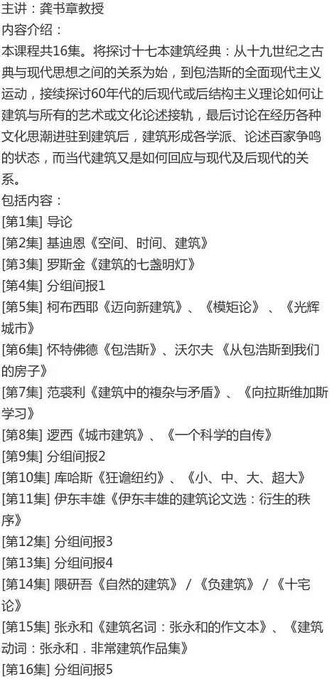 为了方便专业课的学习,我们为大家收集了网络公开课讲座的资源,包含建筑学、城市规划、风景园林、设计学及遗产保护五个专业,本期学习秘籍先为大家提供建筑学专业相关的学习资源。