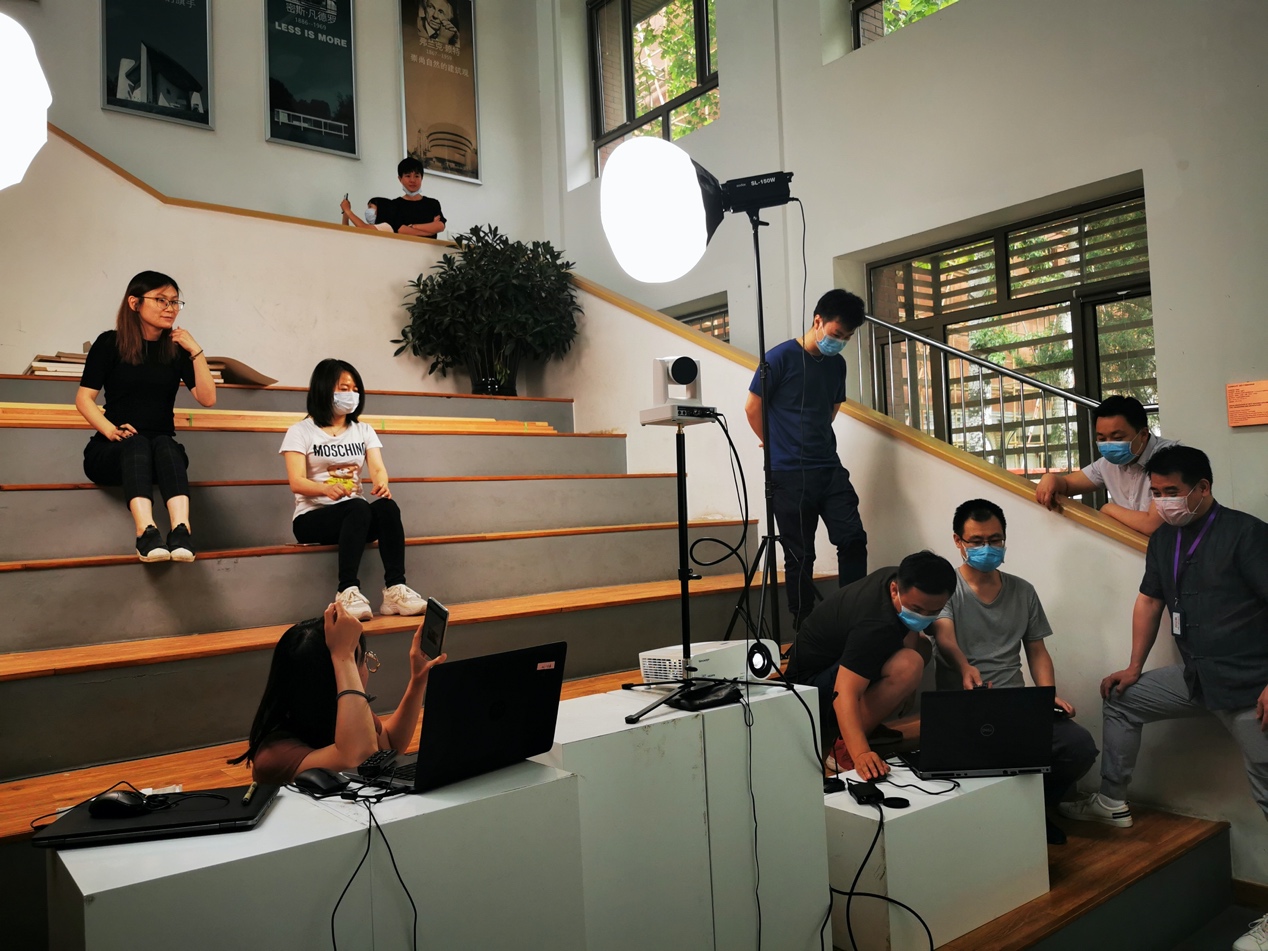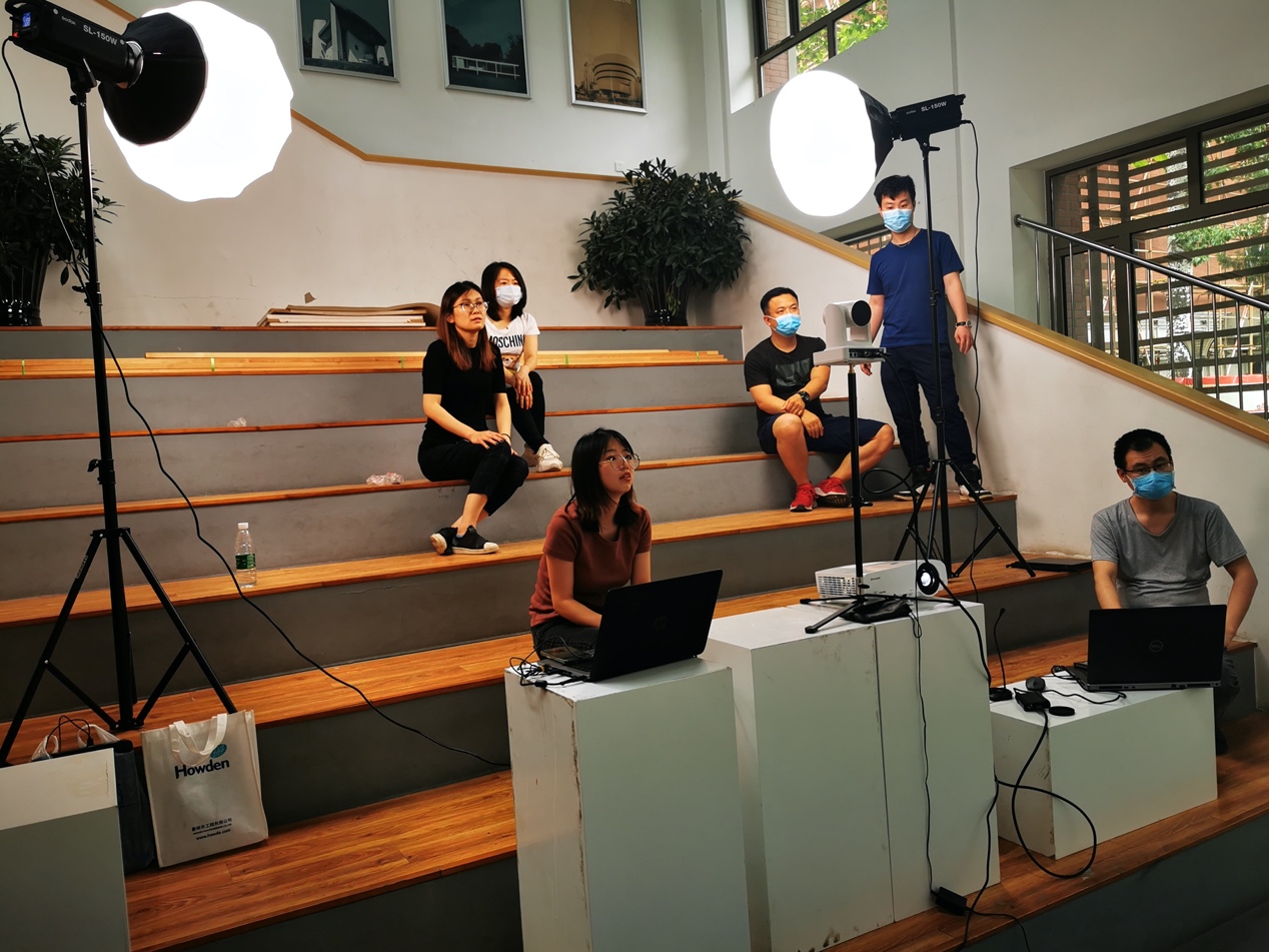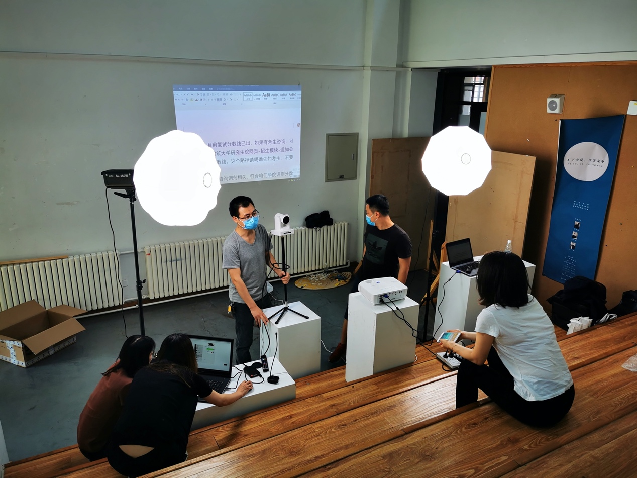 建筑公司为迎接6月中下旬的第二次高考在线咨询直播工作,5月25日下午14点,在西城校区教五楼进行了场地设计与设备调试工作。