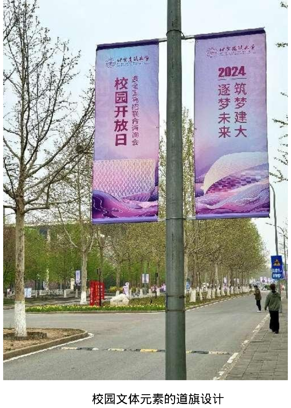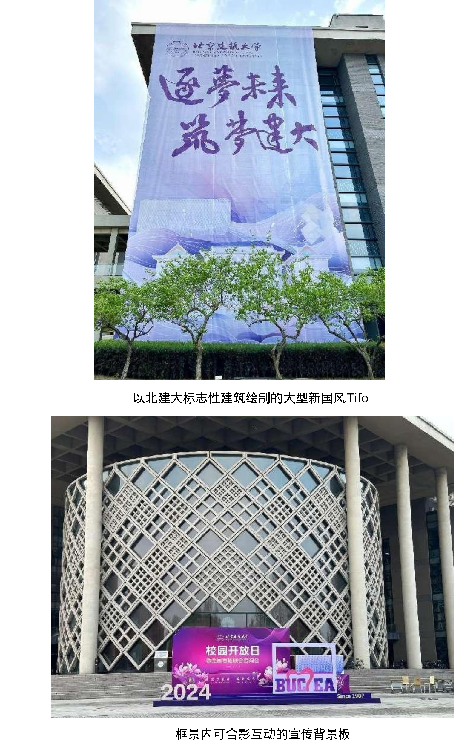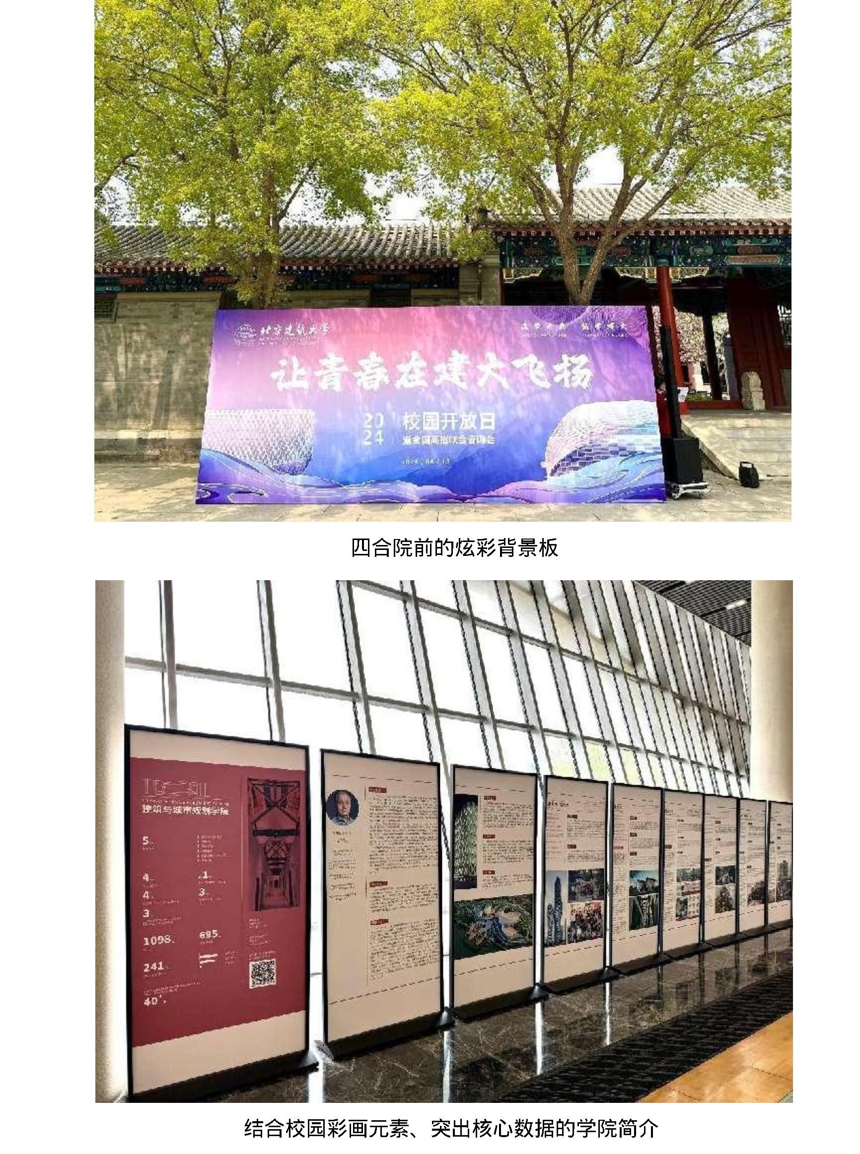 本次校园开放日的视觉系统实现了全方位的立体分布,包括了建筑外立面Tifo、活动背板、道旗、条幅、院系介绍板、引导界面等内容,均直接源自或延伸自吕帅老师设计。在有效传达招生信息、院系风采的同时,许多设计细节体现了建大元素,实现了校园开放日视觉与招生简章视觉在设计语言上的整体统一,体现了公司设计学系交叉多元的专业特色,为本次活动增色添彩。