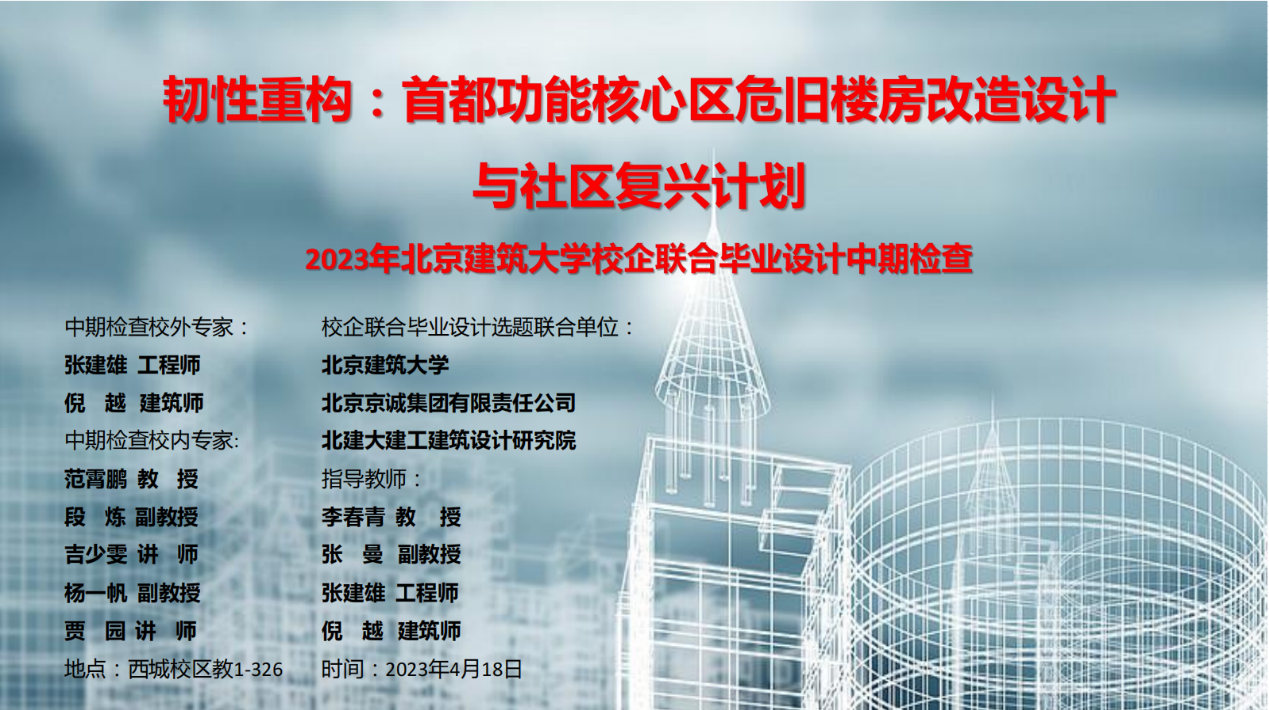 2023年4月18日下午13:00,由李春青教授、张曼副教授指导的bevictor1946韦德官网的校企联合毕业设计“韧性重构:首都功能核心区危旧楼房改造设计与社区复兴计划”组举行中期检查会。会议由检查组组长范霄鹏教授主持,与会专家教师包括北京京诚集团有限责任公司张建雄老师、北建大建工建筑设计研究院倪越老师以及bevictor1946韦德官网历建系副主任杨一帆副教授、建筑系的张羽、吉少雯、贾园等校内教师参加。与会专家和教师在肯定毕业设计选题的基础上,大家对各设计小组的中期成果逐一点评指导,师生讨论热烈。