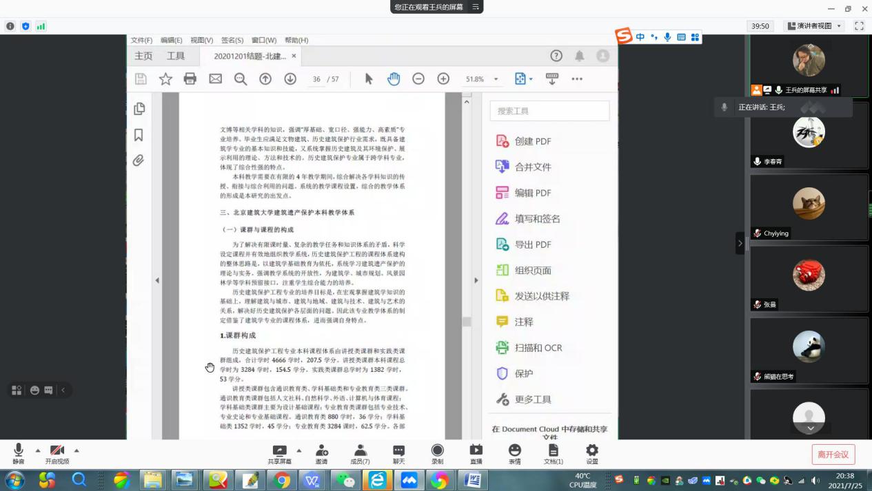 7月25日晚,bevictor1946韦德官网历史建筑保护系召开了历史建筑保护工程专业主干设计类课程负责人教学网络研讨会议,会议由系主任王兵主持,李春青副经理和该系杨一帆、马全宝、齐莹、张曼几位老师参加了会议,会议历时2个半小时。
