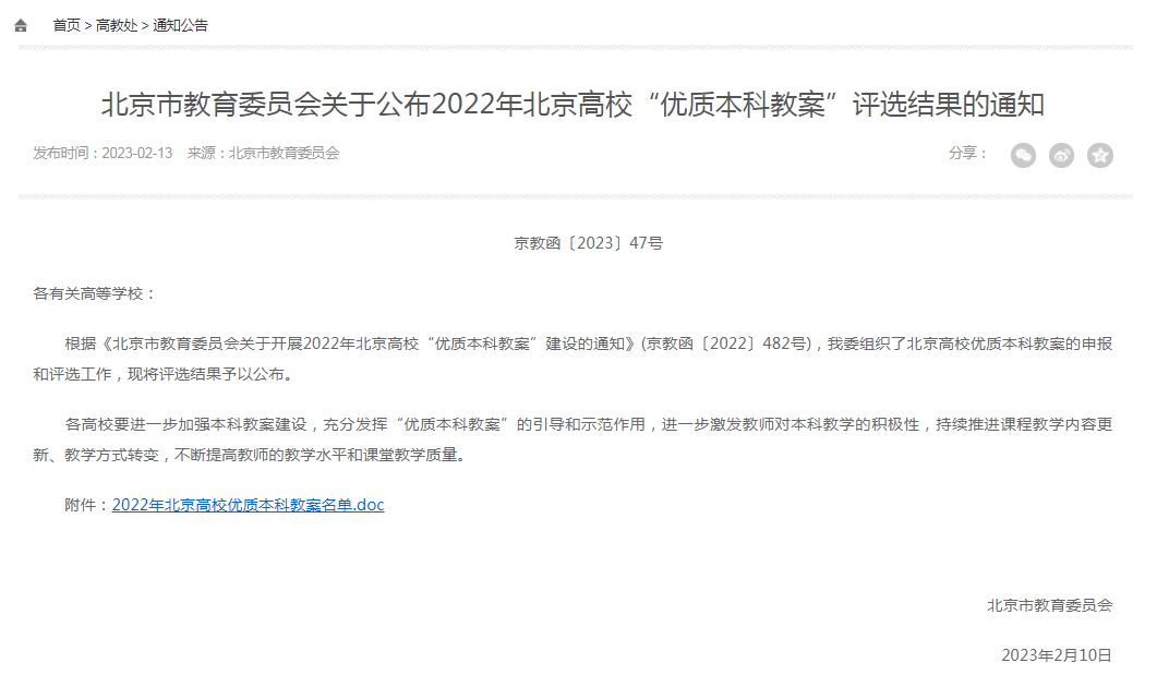 近日,北京市教育委员会下发《关于公布2022年北京高校“优质本科教案”评选结果的通知》(京教函〔2023〕47号),我院《建筑制图》课程教案,获评北京高校“优质本科教案”,教案编制负责人为孟璠磊。