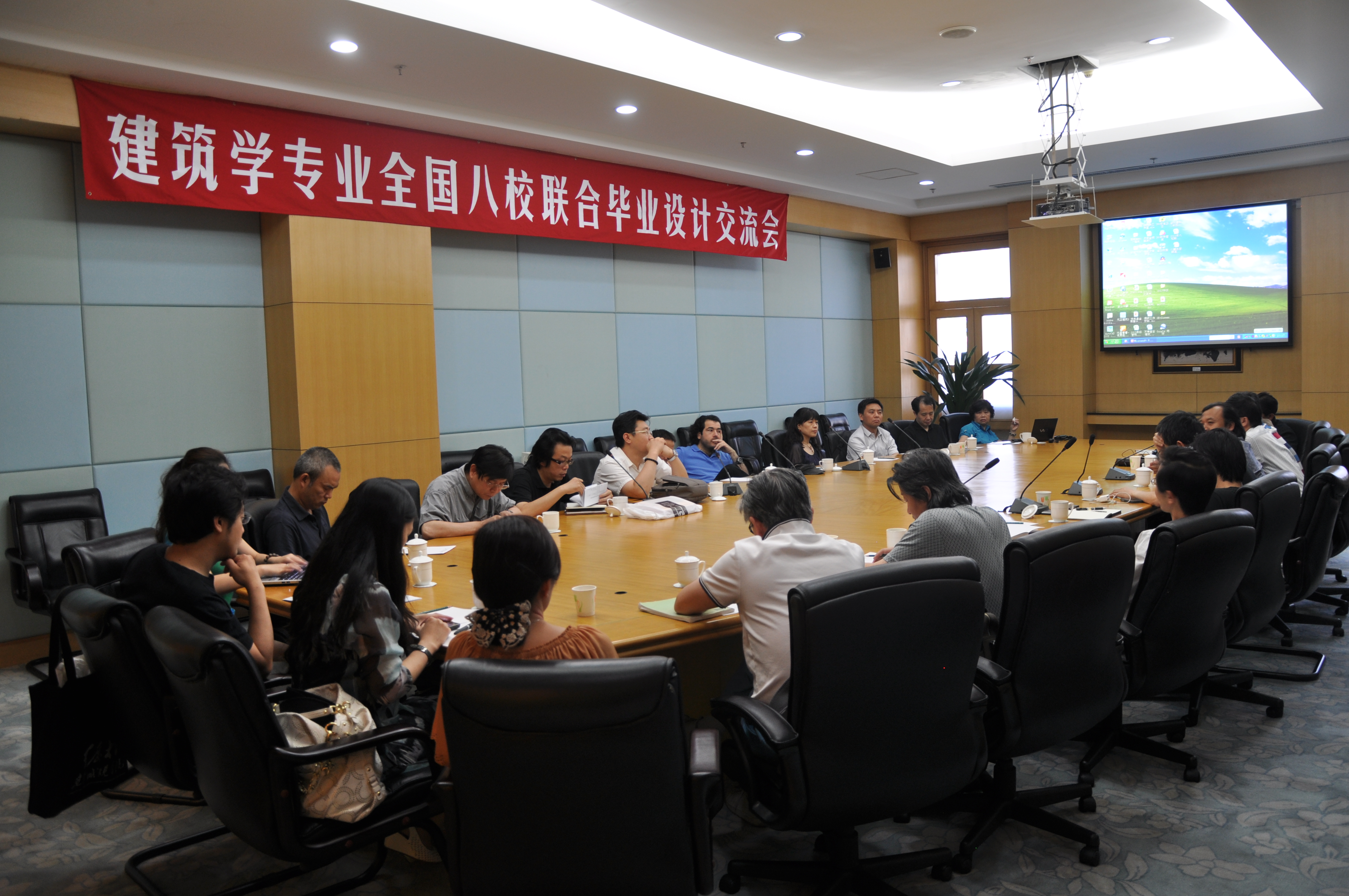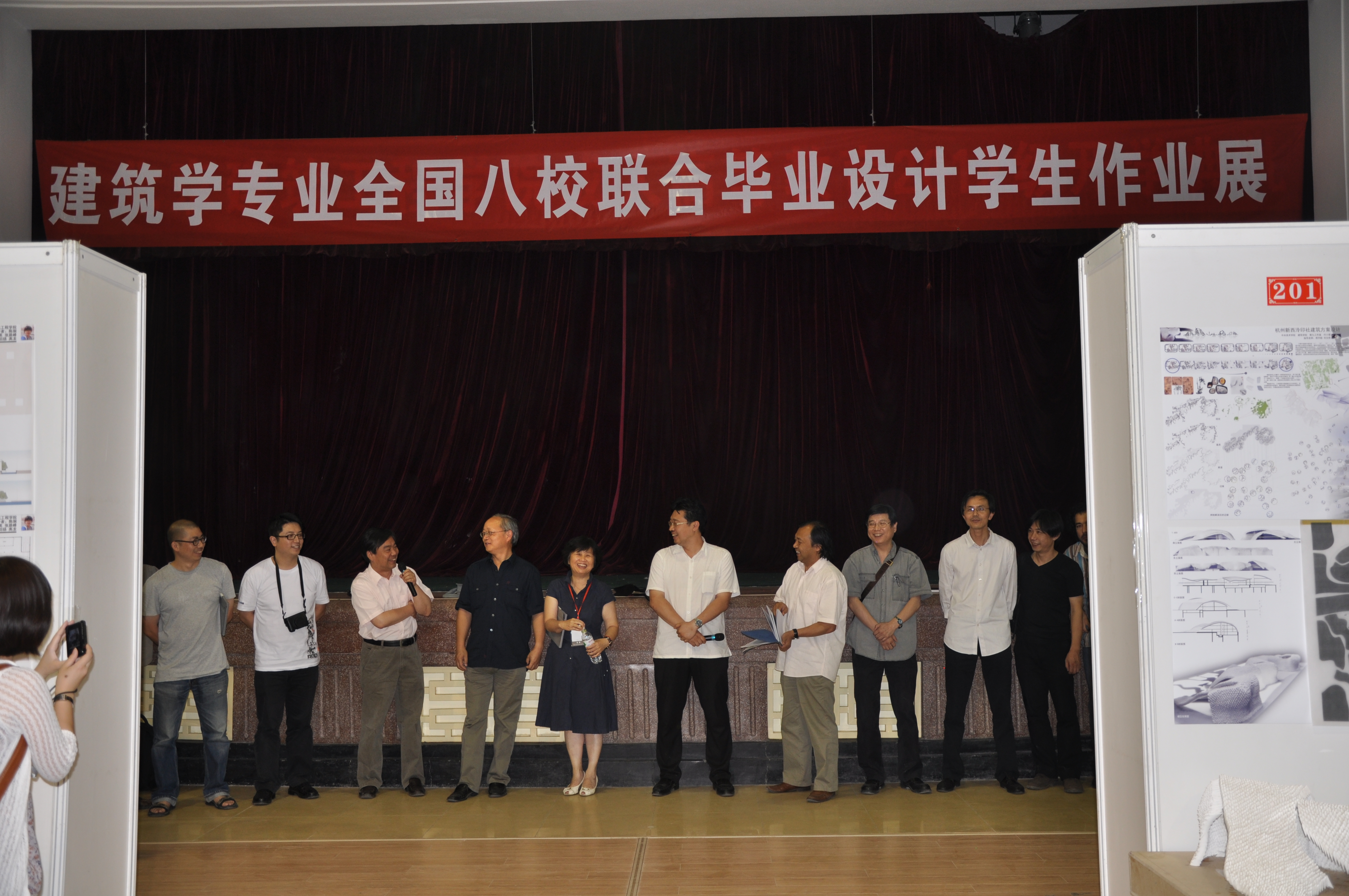 建筑学专业八校联合毕业设计活动是各校毕业设计指导教师联合发起的大规模、连续性教学实验与交流活动,自2007年始办以来,就得到了全国建筑学专业指导委员会的支持。多所院校积极响应、踊跃参与,活动规模不断扩大,活动模式日益成熟。从开始的6校,发展至今已达8校。每届参与师生已超过百人。该活动由各校轮流主办,选题紧密结合主办地热点现实问题和地域文化特征,经过现场调研、中期交流、最终答辩等三个环节的交流,达到教学资源、教学效益共享的目的。前五次活动依次在北京、上海、天津、南京、重庆主办,本次活动为第六次,由浙江大学主办,选题地点在杭州,题目是“从西湖到西溪——杭州新西泠印社建筑设计(八校联合)”,收到作品104件,在公司老员工活动中心进行了作品展示。终期答辩由公司承办。