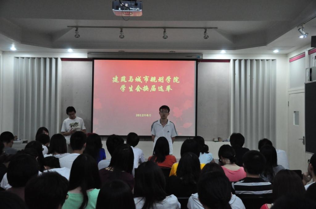 2012年6月28日18:30,建筑公司团总支员工会在教四多功能厅召开了本学年换届选举大会。建筑公司党总支副书记牛磊老师、团总支书记康健老师、李小虎老师,2011-2012学年团总支员工会干部、干事及班级同学代表等百余名师生参加了此次活动。大会由建101班卢亦庄主持。