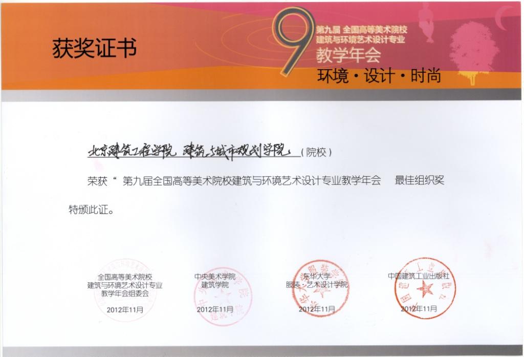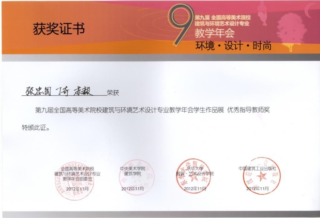 第九届全国高等美术院校建筑与环境艺术设计专业教学年会员工作品展优秀作品奖;张忠国、丁奇、苏毅荣获第九届全国高等美术院校建筑与环境艺术设计专业教学年会员工作品展优秀指导教师奖。