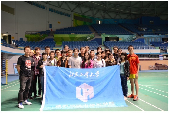 中午12点30分,公司同学由公司集合出发,前往目的地。14点左右,一行人到达北京工业大学南门,受到北工大接待人员的热烈欢迎,并在门前合影留念后,进入校园,来到位于公司东南角的羽毛球馆。