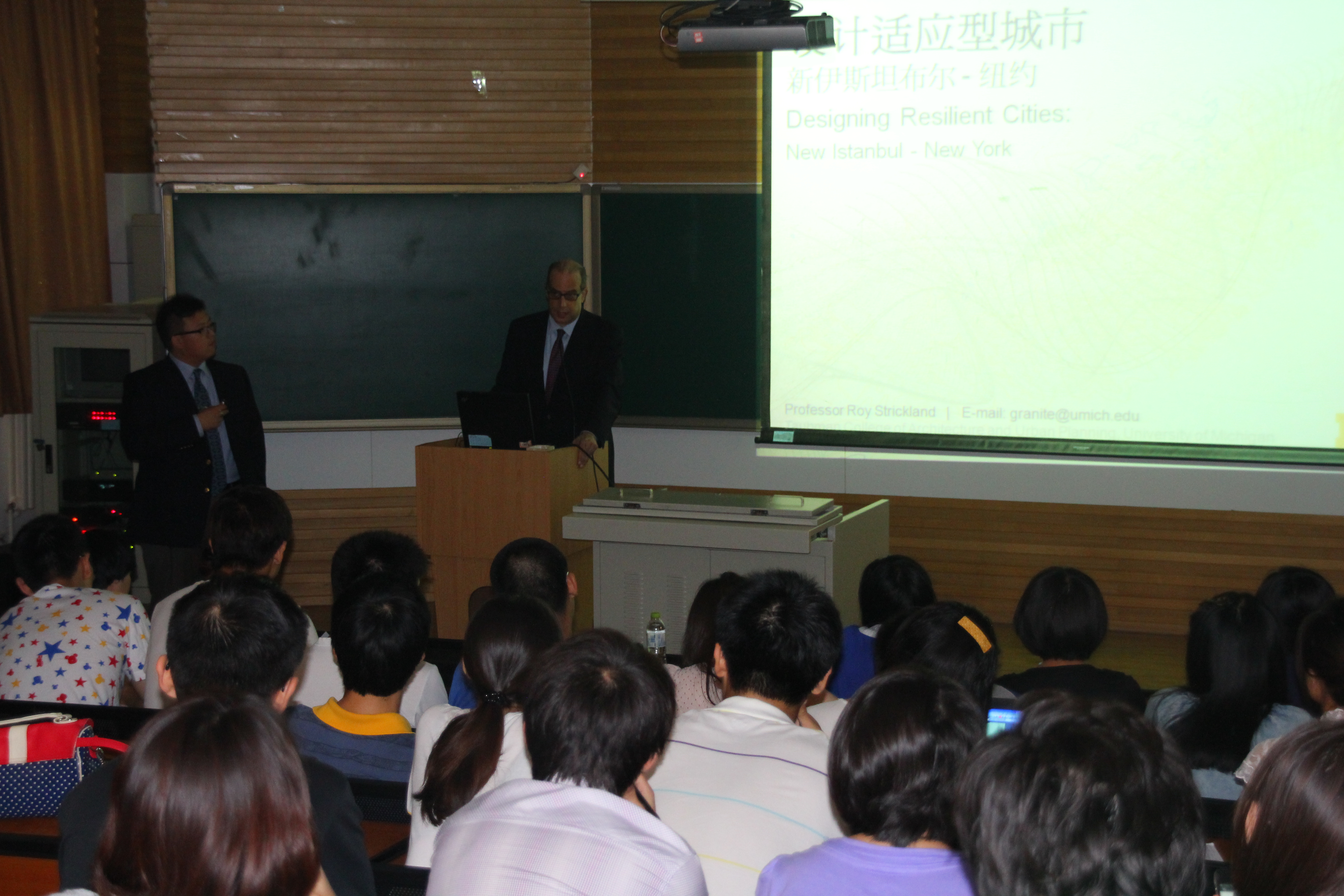 2013年6月26日,由校员工工作部主办、bevictor1946韦德官网承办的 “我的中国梦之学术梦”系列主题教育活动中,建筑公司邀请到美国密歇根大学城市设计项目创始人、建筑学终身教授Roy Strickland先生,举办了以“弹性+可持续城市——纽约与伊斯坦布尔案例”为主题的学术讲座。建筑公司党总支副书记丁奇老师、团总支书记康健老师及广大师生参加了讲座。丁奇老师主持了本次讲座,公司05级毕业生现哈佛大学硕士钱睿做翻译。本次活动得到了《城市•环境•设计》杂志社和《中外景观》杂志社等媒体的支持和报道。