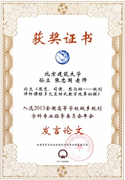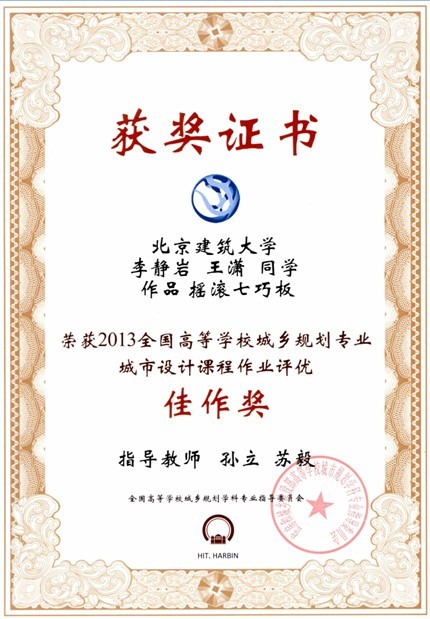 在专指委全体会上,还对今年的获奖作品进行了表彰。公司孙立、张忠国的教研论文《思变、司便、思与辨—规划评析课程多元互动式教学改革初探》获得优秀论文奖,并应邀在大会上作了宣讲;员工范金龙、赵洪民、李嘉宇、付乐的《“单停单行”方案分类深化》获得城市交通出行创新实践竞赛三等奖,指导教师是范霄鹏;员工李静岩、王潇的《摇滚七巧板》获得城市设计竞赛佳作奖,指导教师是孙立、苏毅;员工王煦立、李晨卉的《倏忽怡然》获得城市设计竞赛佳作奖,指导教师是苏毅、孙立。