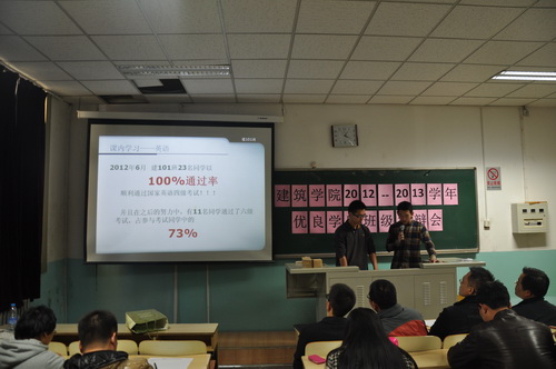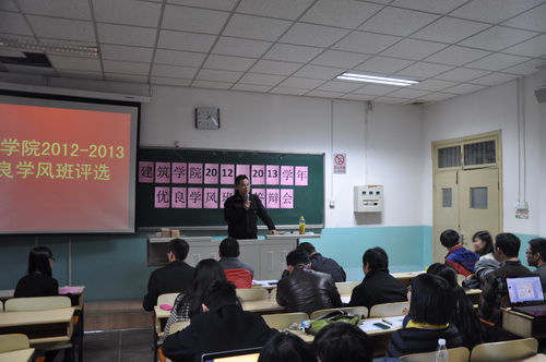 2013年11月14日下午1点,建筑公司在西城校区教1-102举行了2013-2013学年 “优良学风班”评比活动,共有2009-2012级4个年级15个班级参加评选。此次活动邀请学工部部长黄尚荣老师、建筑公司党总支书记牛磊老师、党总支副书记丁奇老师以及各班级导师作为评委参与活动并进行评分。