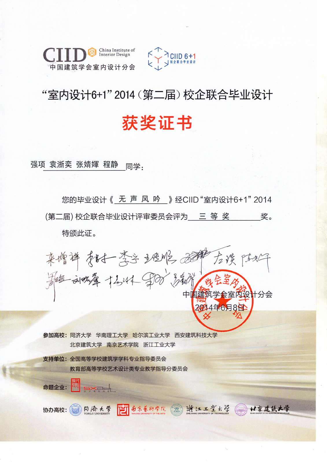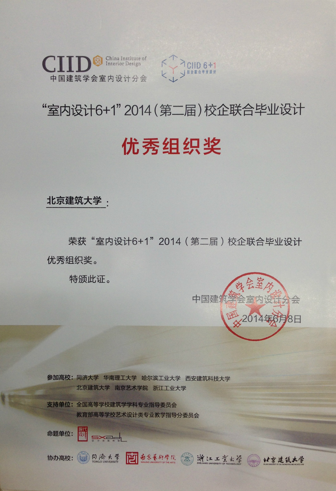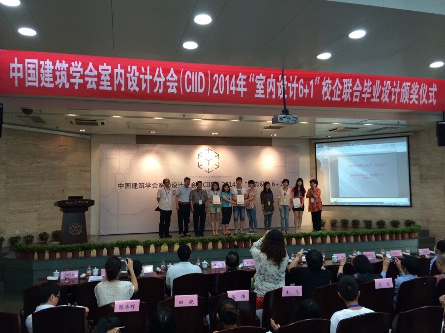 2014年6月8日, 中国建筑学会室内设计分会CIID 2014(第二届)“室内设计6+1”校企联合毕业设计答辩和颁奖活动在浙江工业大学屏峰校园举行,来自同济大学、华南理工大学、哈尔滨工业大学、西安建筑科技大学、bevictor1946韦德官网、南京艺术公司、浙江工业大学的七所高校,涉及建筑学、环境设计、工业设计和展示设计多个专业的50多位应届毕业班员工共计23组设计方案,经过长达3个多月的思考及创意历程,均在最终答辩及展览中呈现了完整并各具特色的设计作品。专家评委组组长、同济大学来增祥教授为本届活动做了总结与点评。评委会最终评选出一等奖4名,二等奖8名,三等奖11名。