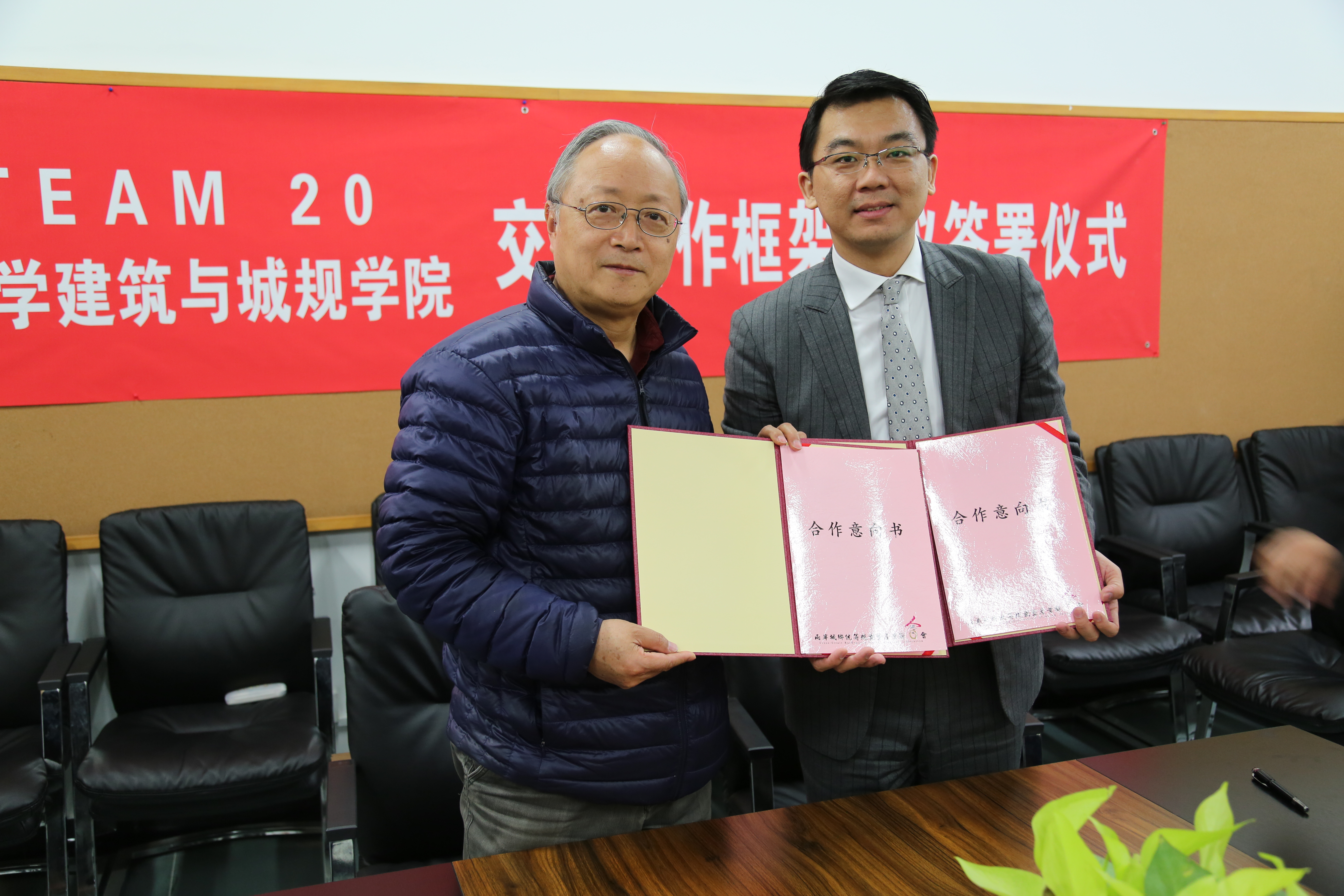 会议最后,由经理刘临安教授接受魏孝宇先生赠送的TEAM 20感谢奖杯,并与刘以善先生互赠具有两岸特色的礼物,书记牛磊与魏孝宇先生互赠书籍。在双方签署了下一阶段的合作意向后,会谈在热烈的合影中落下帷幕。