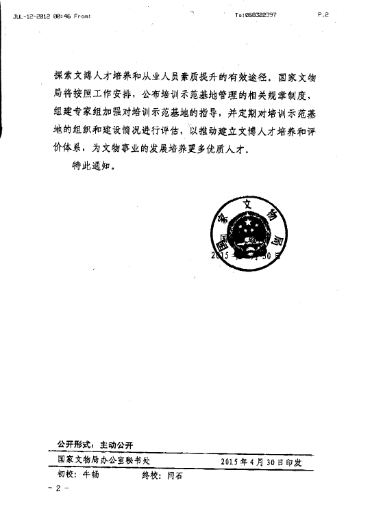 2015年4月30日,国家文物局办公室印发文物人函【2015】2383号,公司成功获批列入国家文物局文博人才培训示范基地名单,同时列入的单位还有故宫博物院等共计九家单位。