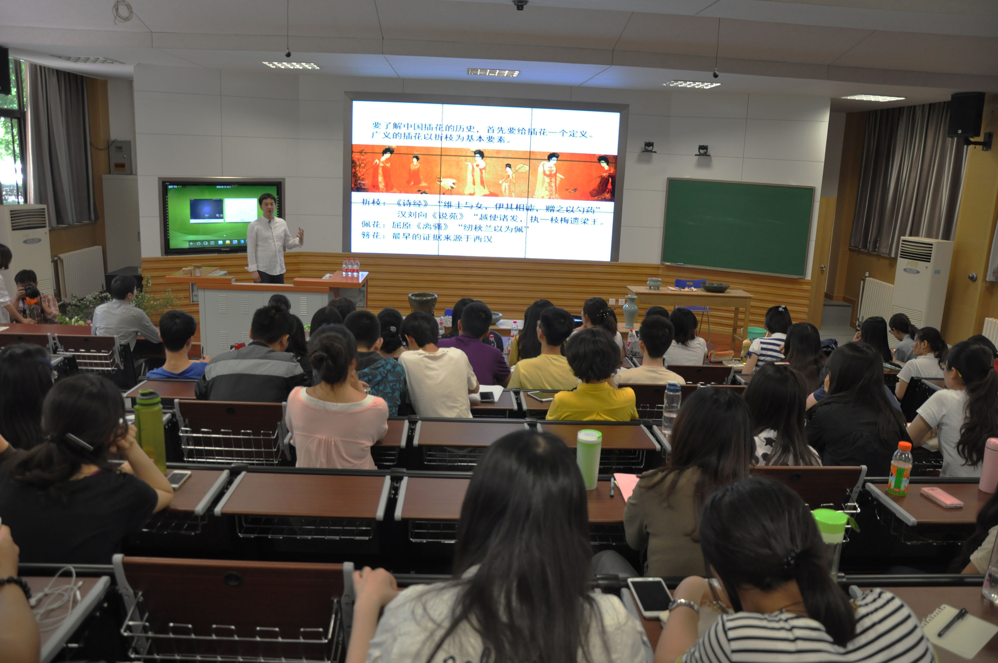 万宏老师将插花从庞大复杂的中华文化脉络中提取出来,讲述贯穿中华历史的传统插花文化。他从自《诗经》中的诗句说起,详细地讲解了历史中的折枝、佩花、簪花。插花起源于春秋战国时期,在东汉墓葬壁画便已有了插花的雏形,而最早的确切文字记载则是南北朝时期。而后随着佛教的传入,插花艺术得到了极大地发展。从唐朝时期形成的以丰满华丽为特征的宫廷插花,到宋朝崇尚简谱、素雅的中国文人插花风格以及讲究层次顺序的“理念花”,再到元朝崇尚“学而优则仕”的汉族文人创造的“心象花”,以及明代从宫廷插花到民间插花的转变,到最后清末插花文化的衰落,无不显示着插花文化在我国历史中的重要地位。在演讲的最后,他讲述了由阴阳发展而来的插花风格十全式、两仪式、三才式等等。