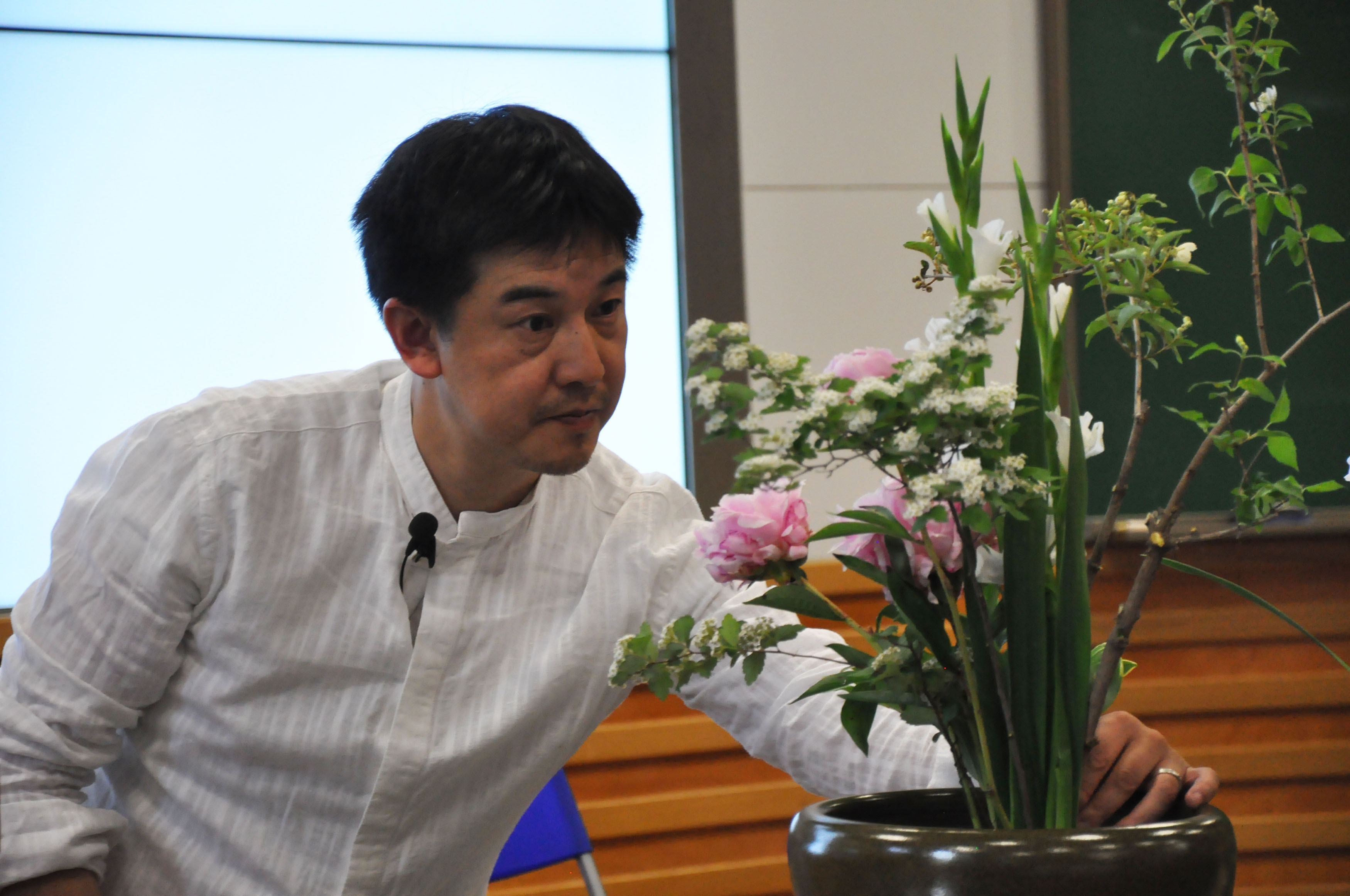 在万老师演讲期间,他先后邀请他的助教李光伟老师、肖老师、黄老师为同学们现场展示了不同的插花技法。并且在演讲结束后,老师亲自表演插花技法中最难的十全式,其精湛的插花技艺博得在场师生的阵阵掌声。