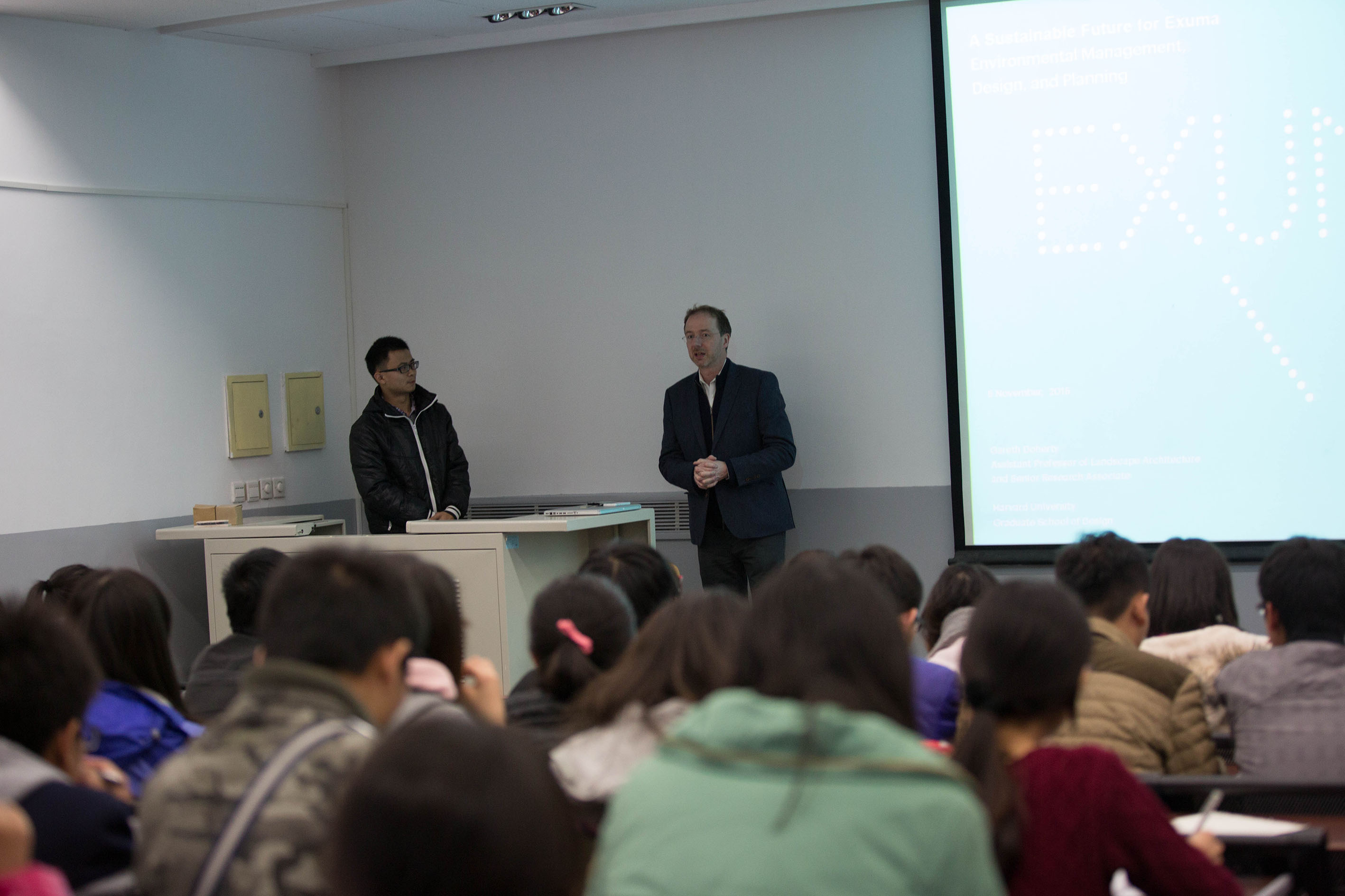 这次讲座内容主要分为三部分:生态人文讲解、实践及个人经历与见解。首先介绍了由Gareth Doherty与哈佛设计公司经理Mohsen Mostafavi共同编辑的著作《生态都市主义(ecological urbanism)》,简述这本书所深入阐述的城市化与艺术、环境、政府、公共健康、社会、技术、生态等各个方面之间的关系,并探讨了生态都市主义的理论内涵和应用。引出十个关键词,其中“合作”出现3次,为最重要词汇。接下来阐述环境分为社会及平民方面,Gareth Doherty说设计人类学在观点上非常注意主客转换,而且强调实地的个案调查及设计与环境的融合。他提倡绿色理念,增加绿地面积。而后,以亲身参与的活动的图片及制作的资料、图表、数据为媒介深入讲述生态及人文景观的含义和研究的思考见解。以前辈人的身份引导、启迪同学,同时表达了对设计人类学未来发展的预测及期望。最后几名同学踊跃提问如“在实践中为当地居民带去什么样的改观”“设计人类学的应用”等,教授一一耐心解答并对同学提出鼓励。