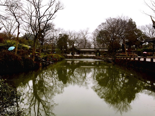 毫无疑问的是,一进拙政园就被这座“水中园”折服了。林木葱郁,水色迷茫,四围苍树环合河塘,成双成对的鸳鸯在水中嬉戏游水,池影倒现亭台楼阁,偶有冬鸟掠过,水镜潋滟,乌色灵闪,虚虚实实,如梦如幻,这样一来延伸了空间,给烟雨中的小楼平添一份神秘感,二来使原本静态的景物灵动地有了生命力。一池小塘,不枯翠荫,池广林茂,乍现小楼。在拙政园,自然景物与人文财富相间相生,浑然天成。
